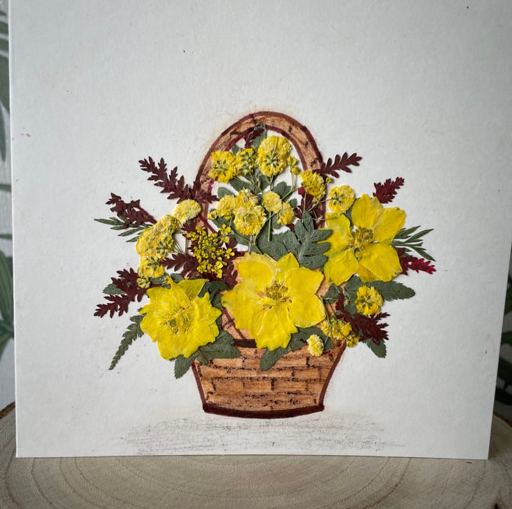 Handmade card with beautiful pressed flowers arranged in hand drawn basket using pastels and felt tips.