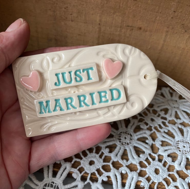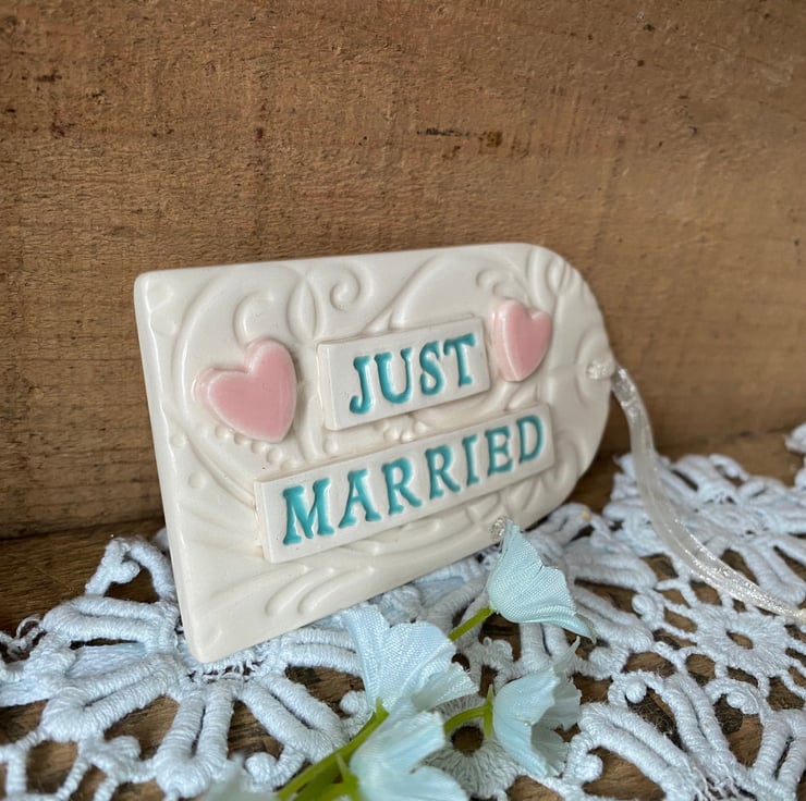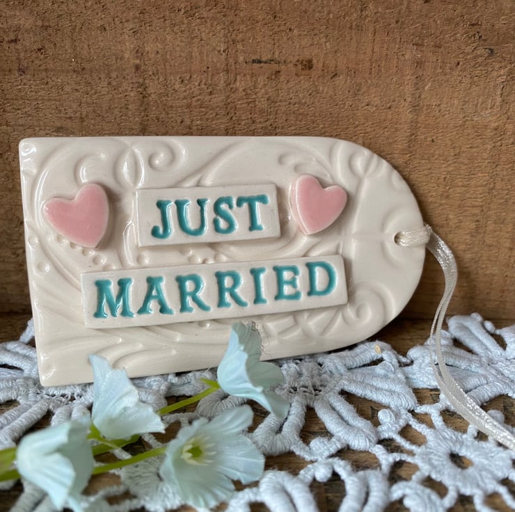 This tag decoration is made from white earthenware clay and is finished two little pink hearts.