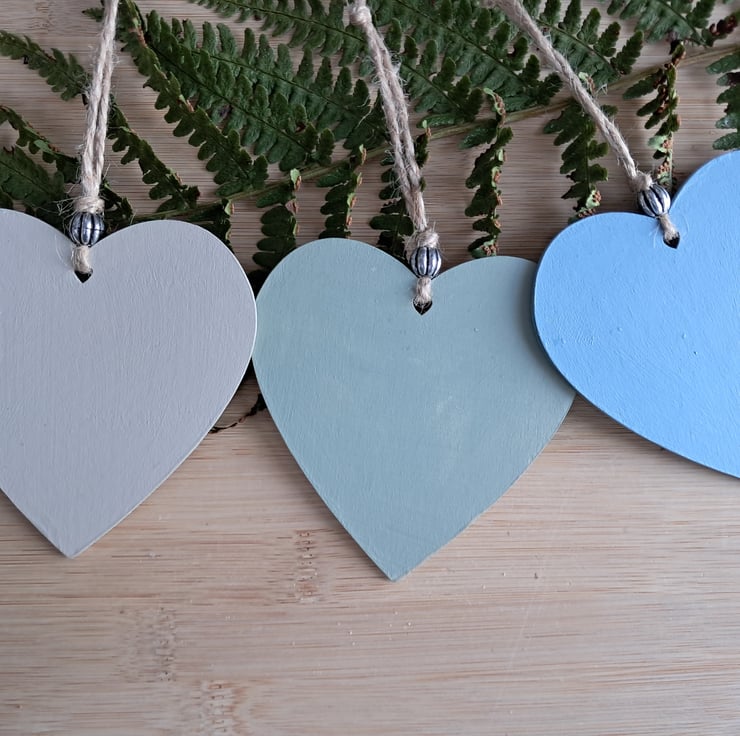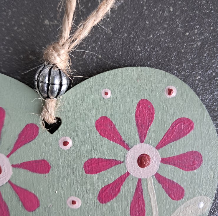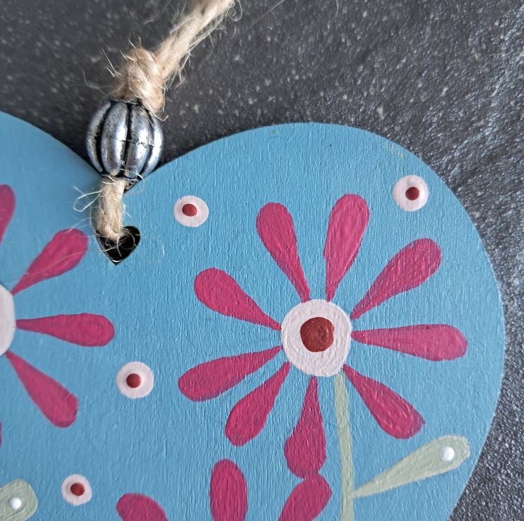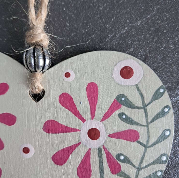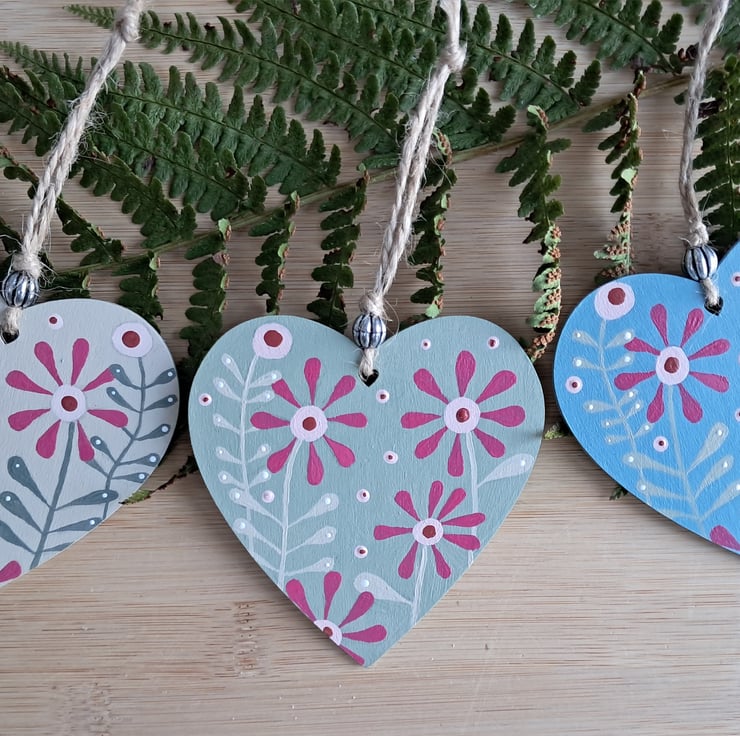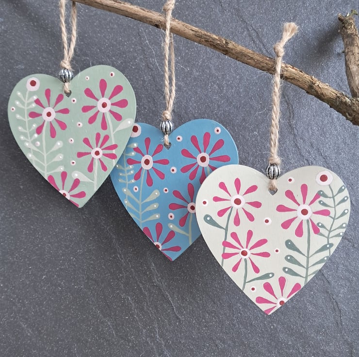 Bring a touch of charm to your home with these hand painted wooden hearts. Each heart is carefully hand painted in natural shades with a folk-art inspiration, using pinks, greens and blues to harmonise with each other. Finished with natural twine and a decorative metal bead, they are perfect for hanging on walls, door handles or as a perfect gift for someone special. These can be bought individually or as a trio.