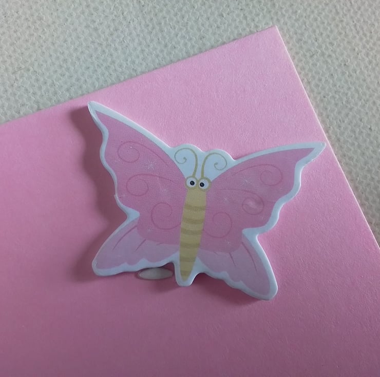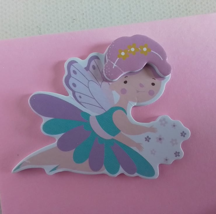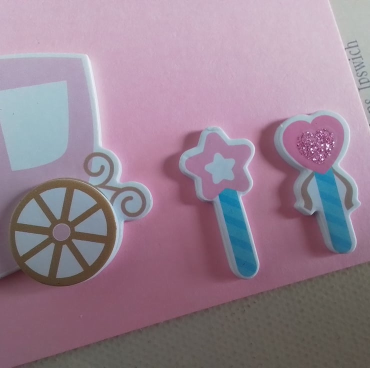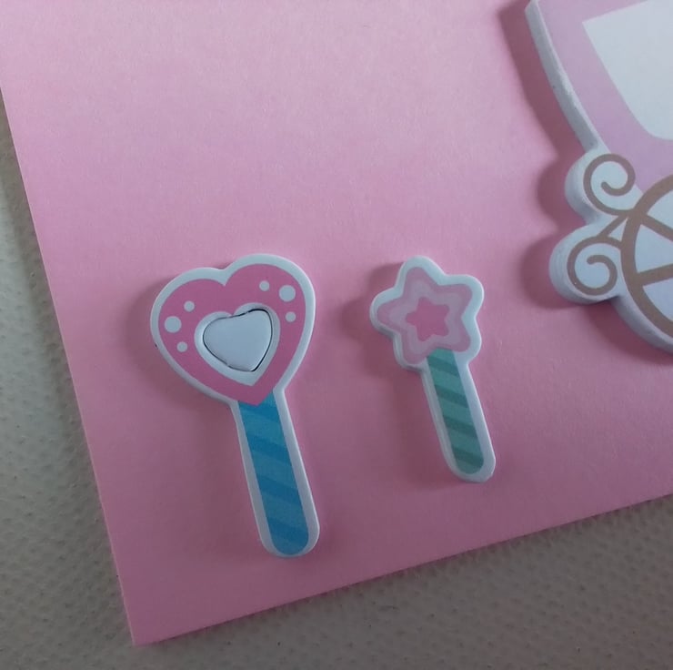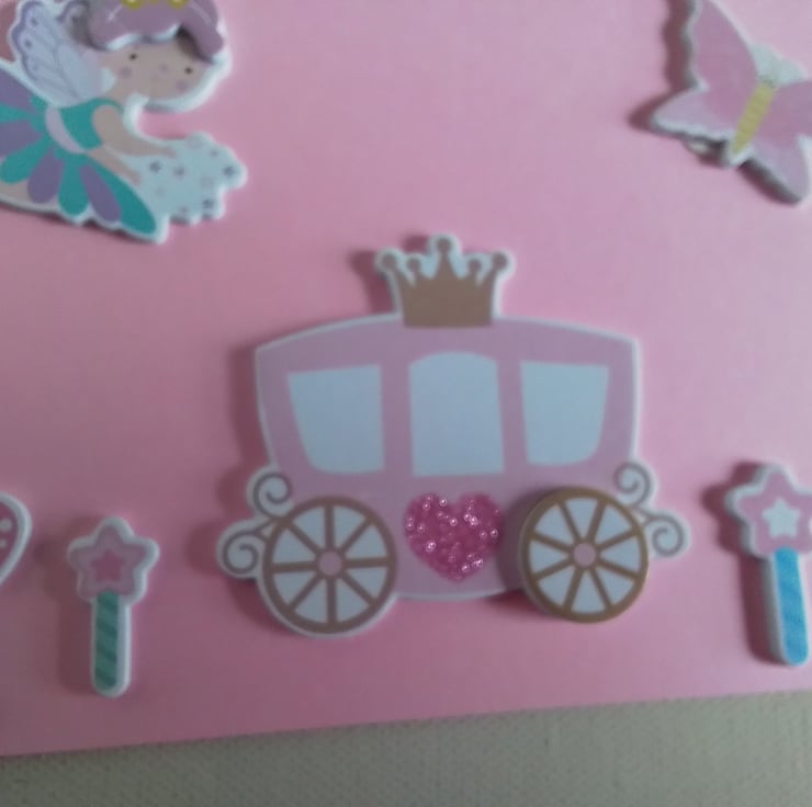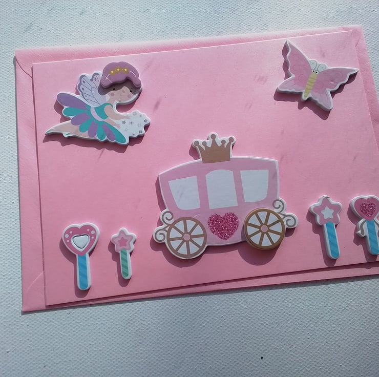 A princess carriage is on the front of this pink card with a fairy and butterfly above. Magical!