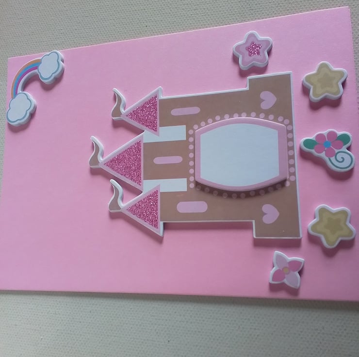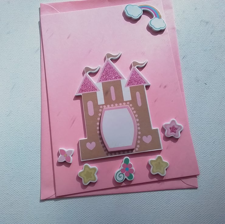 A fairy castle sits on the front of this card with a magical rainbow above and flowers surrounding.
