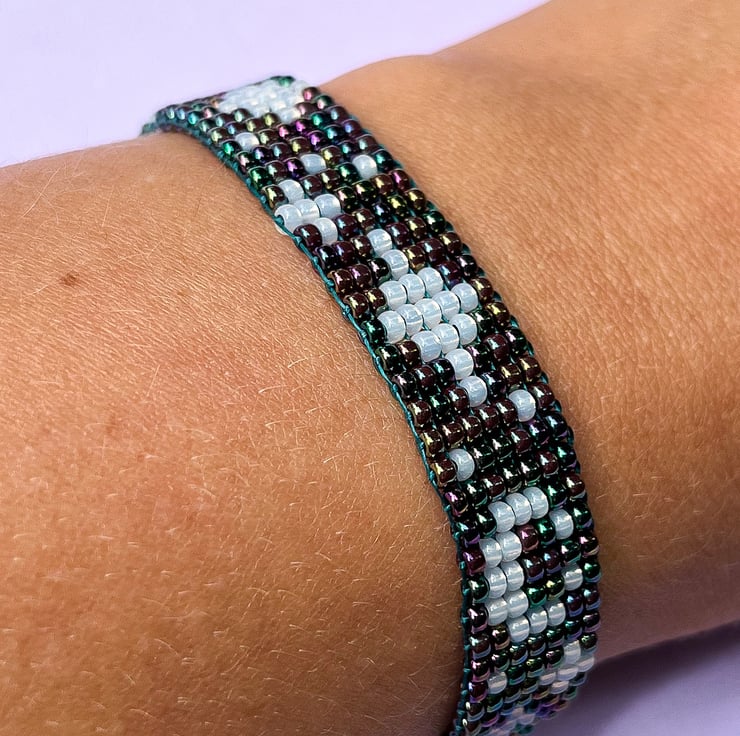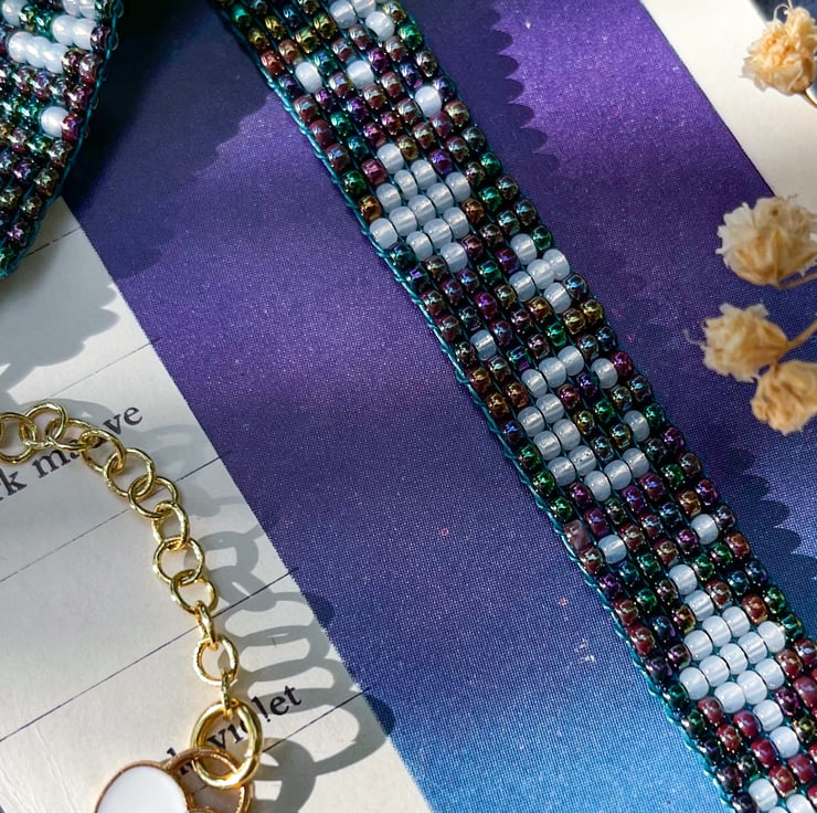 Handmade on a homemade bead loom, this bracelet is a little piece of night sky you can wear on your wrist. Tiny Miyuki beads are woven together to form a celestial pattern of moons and stars, with opal-effect beads shimmering against a rich black alabaster base that shifts beautifully with hints of purple and green.