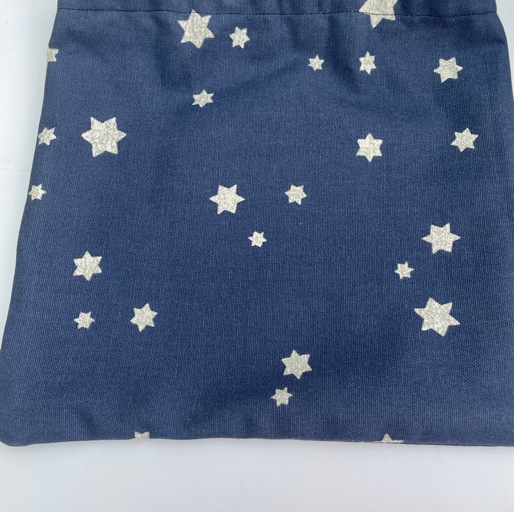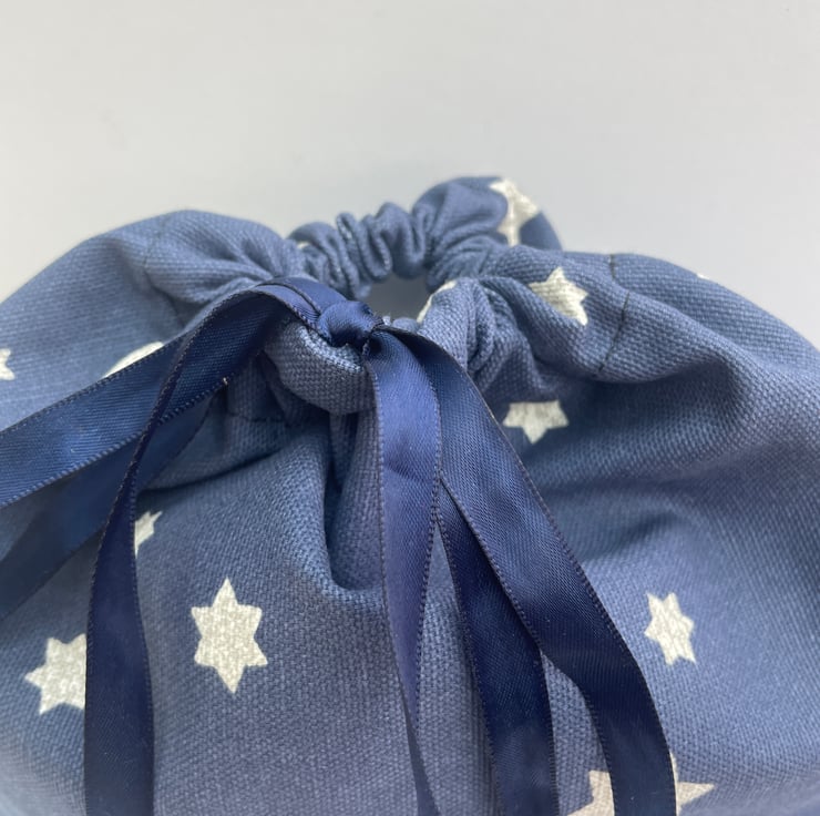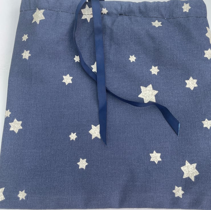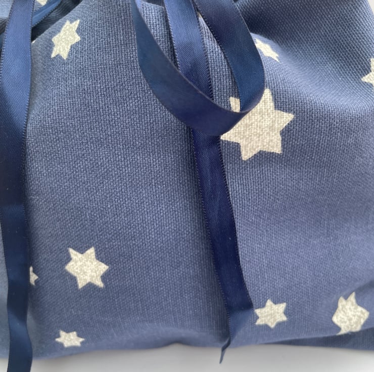 Saving the planet 1 gift at a time. This lovely gift bag measures 24x24.5cm in size. It is made from a very thick and durable 100% cotton fabric from John Lewis, probably curtain fabric and it came from an off cut so no waste. The fabric is a light navy blue with white stars speckled with silver scattered randomly across it. The bag is made with french seams so no raw edges are visible so there will be no fraying. It has a navy blue satin ribbon tie at the top. It is ideal for a medium sized gift or for storage. As a new Grandma I have been told that these small cloth bags are a great way to store and carry those small and easily lost baby items, my daughter uses them for socks, changes of clothes, nappies and much more. I hope you find them useful too. Send a gift and the recipient can then use them again and again.