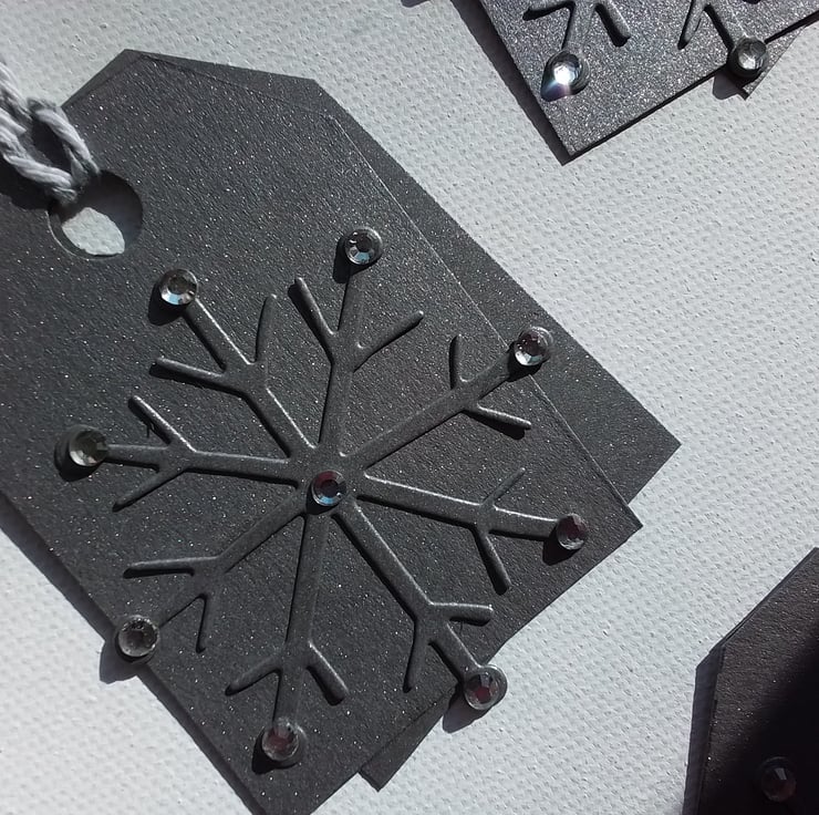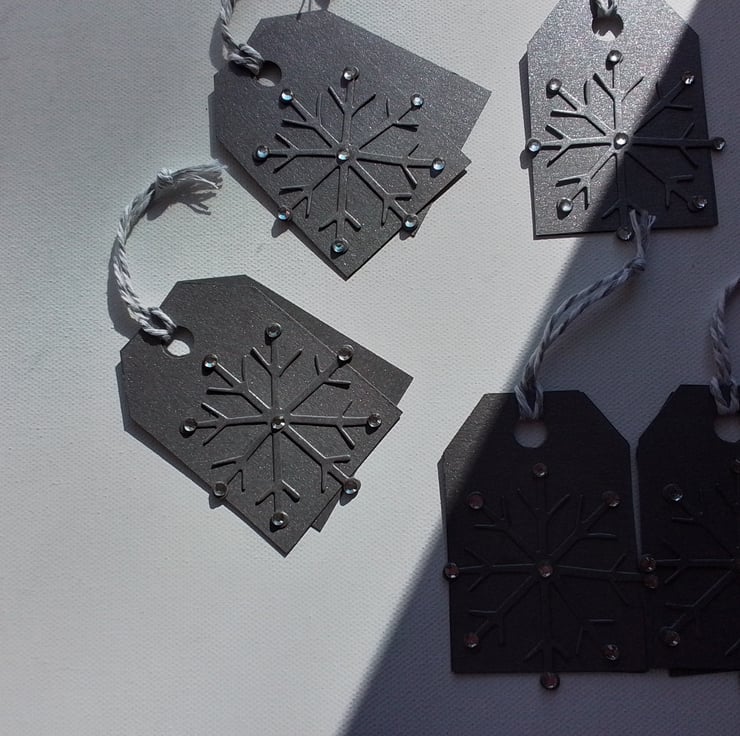 Each snowflake has silver beads around the edge and in the centre and are tied with grey and white twine.