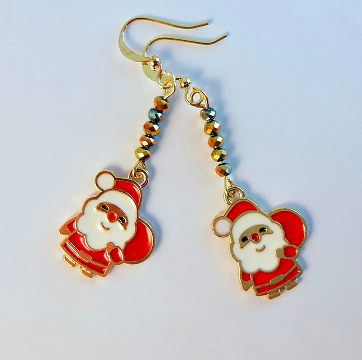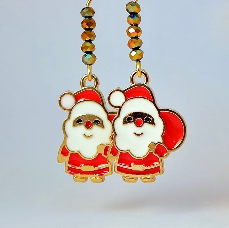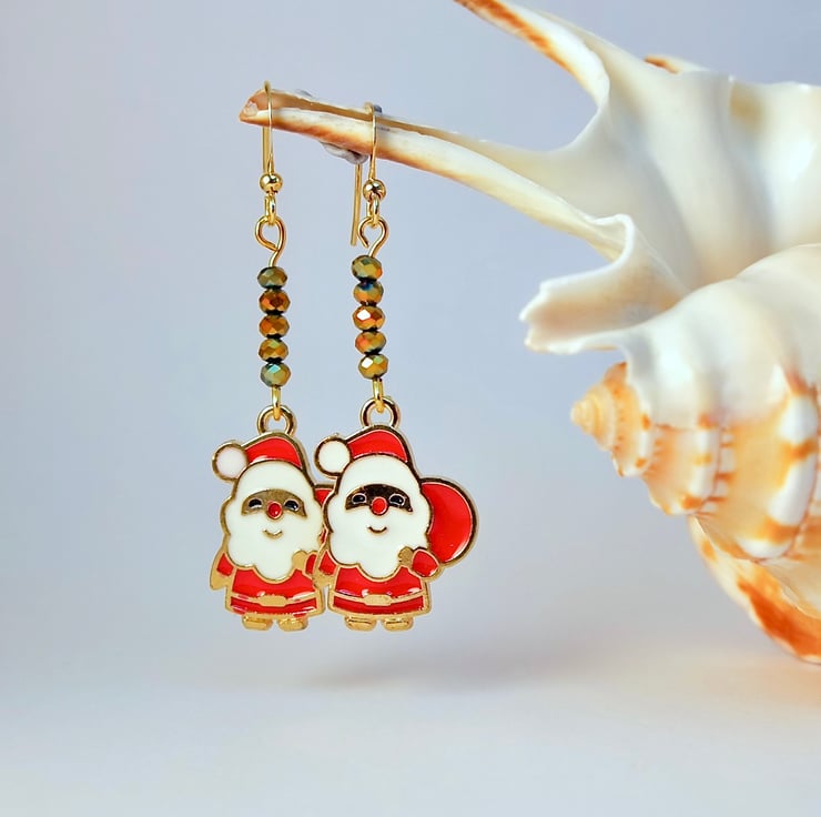 Cute enamel Santa charm earrings topped with five festive faceted glass rondelles in a metallic gold colour with flashes of green and red.