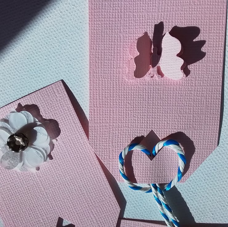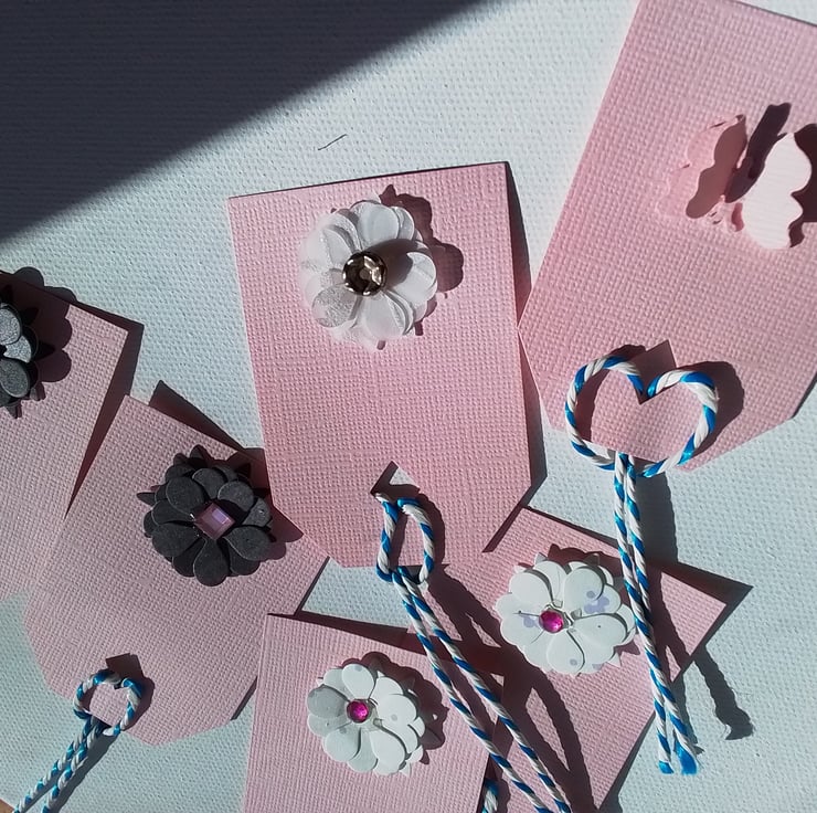 The tags are in pink and have various flowers on, each with a bead in the centre.