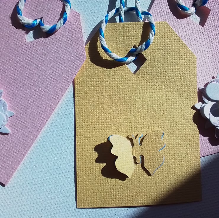 A set of 6 pink, yellow and blue gift tags, suitable for any occasion with butterflies and flowers on.