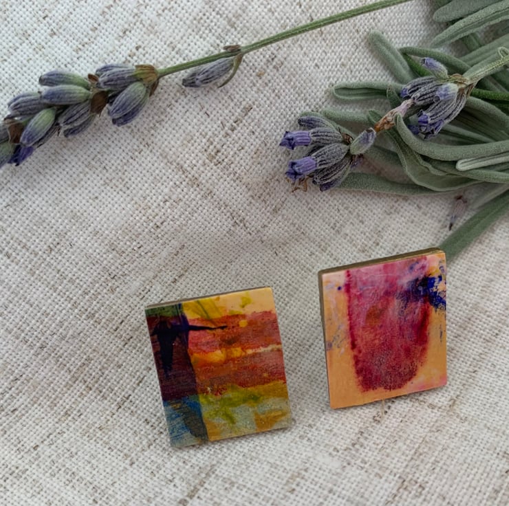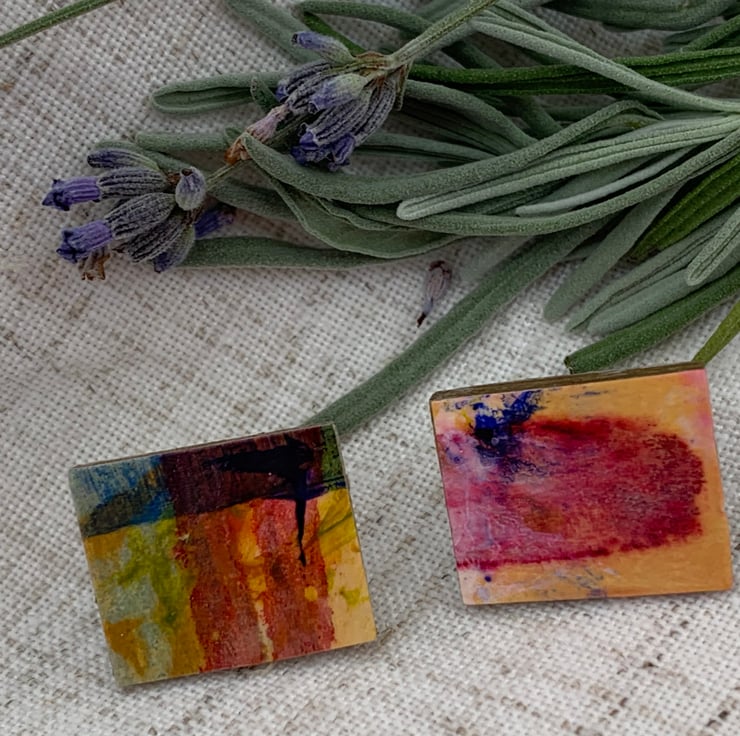 Handcrafted individual pieces of miniature abstract art, combined with its non identical twin, to make a unique pair of earrings. Posts are Sterling Silver to be suitable for sensitive skin.