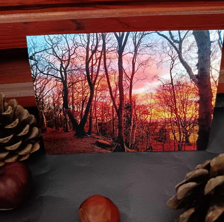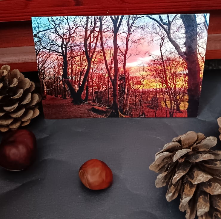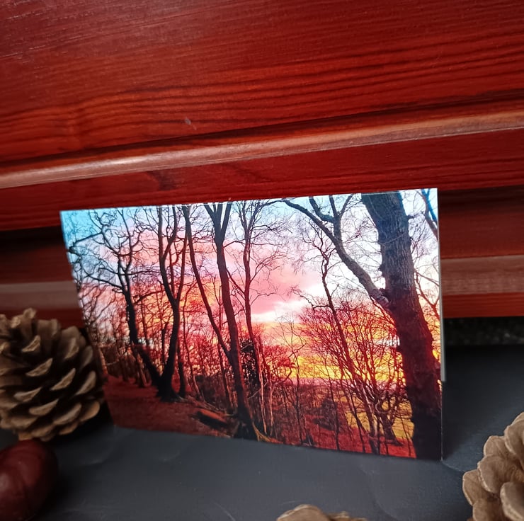 This A6 greetings card features a photograph I took of a winter sunset in my local Storeton Woods, Wirral. The inside is blank for your own message and an A6 envelope is included; this piece is made of 360 gsm silk card.