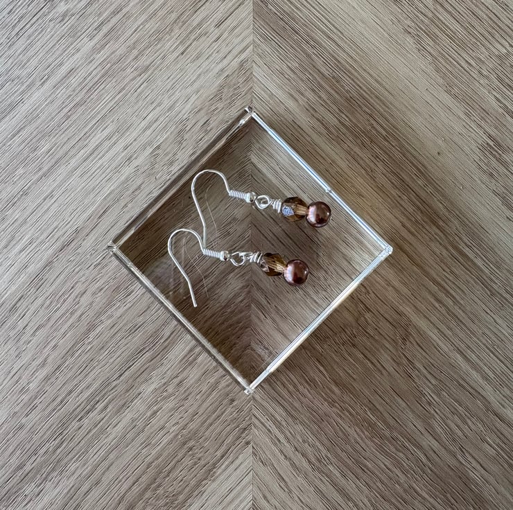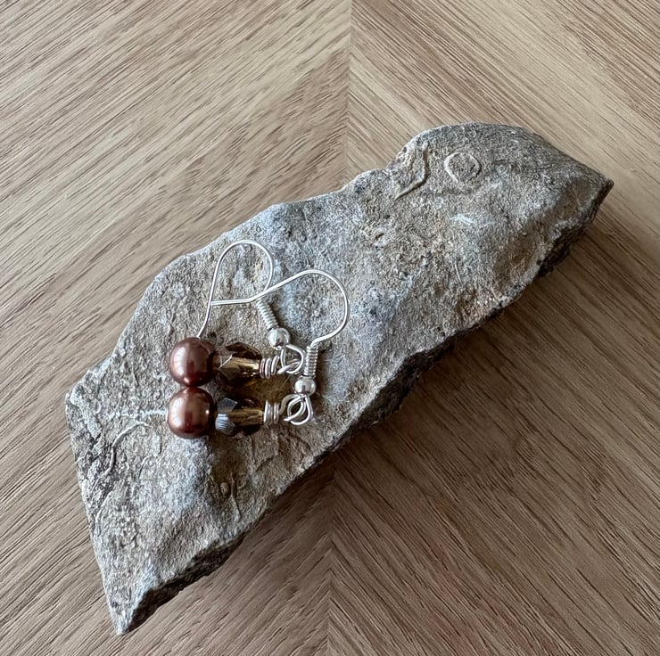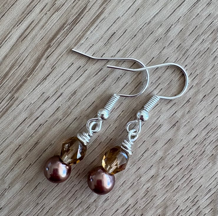 Warm dainty brown dangle and drop earrings made from brown glass pearls, and brown fire polished beads.