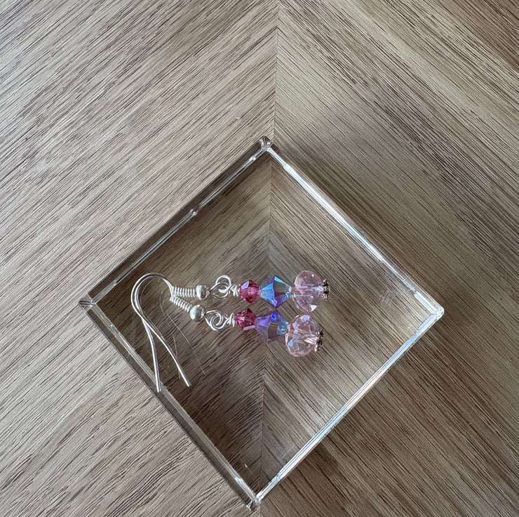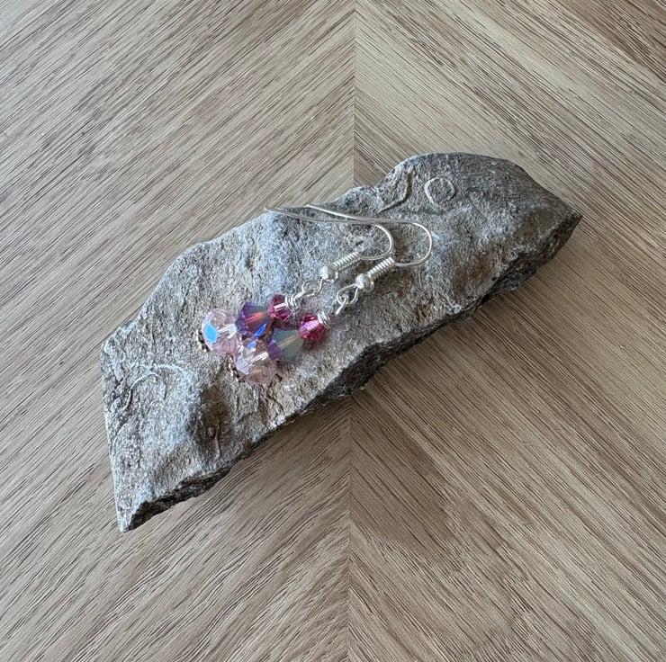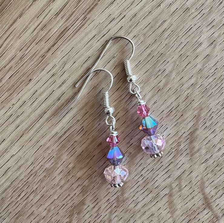Pale pink dangle and drop earrings made from pale pink rondelle beads, two tone pinky mauvy bicone beads and smaller pink bicone beads with silver plated Bali spacer beads.