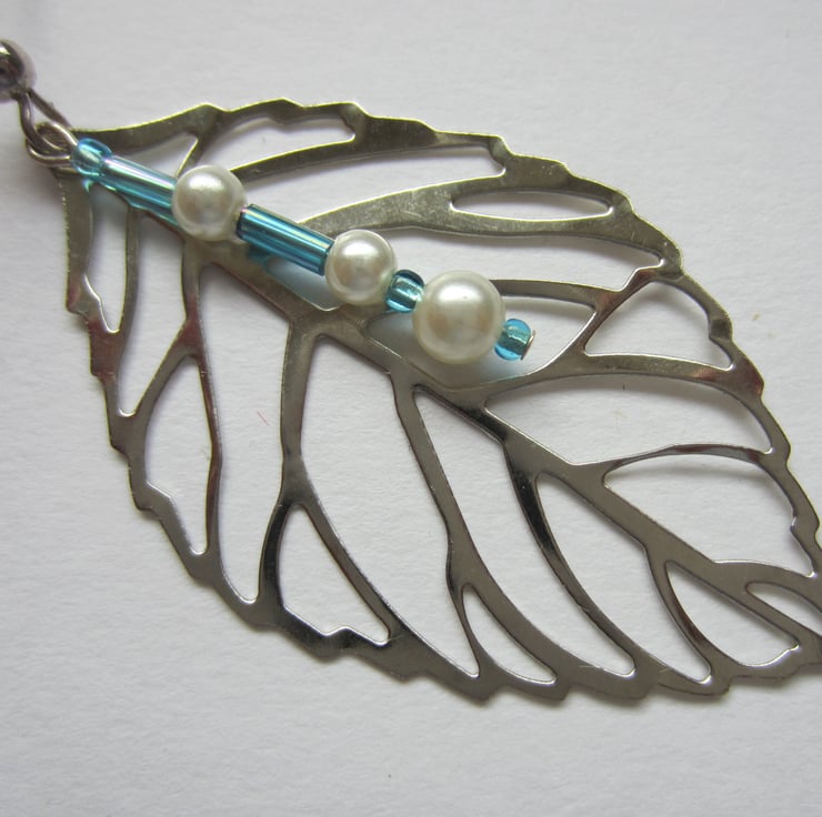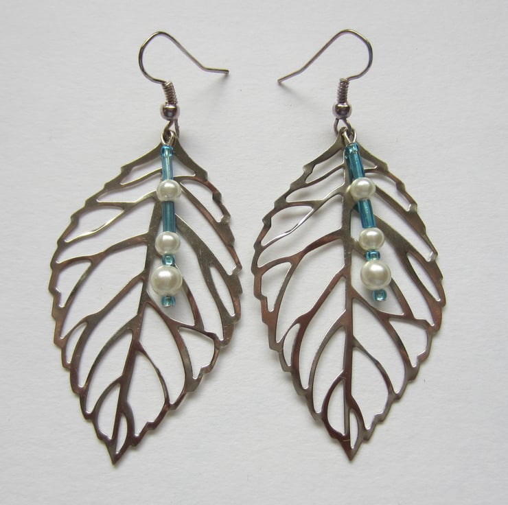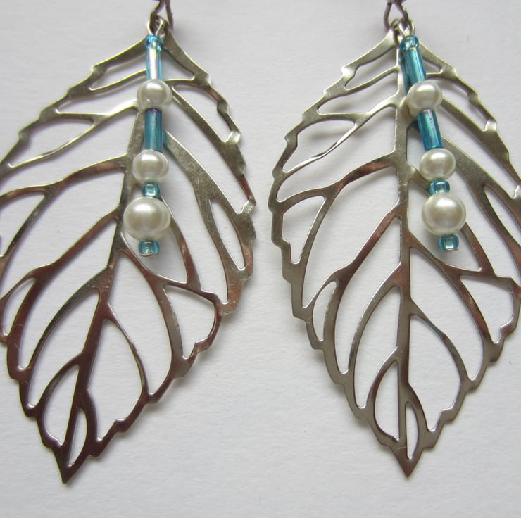 Pair of earrings made from silver tone metal leaves and blue and white beads. They hang from silver plated ear wires.