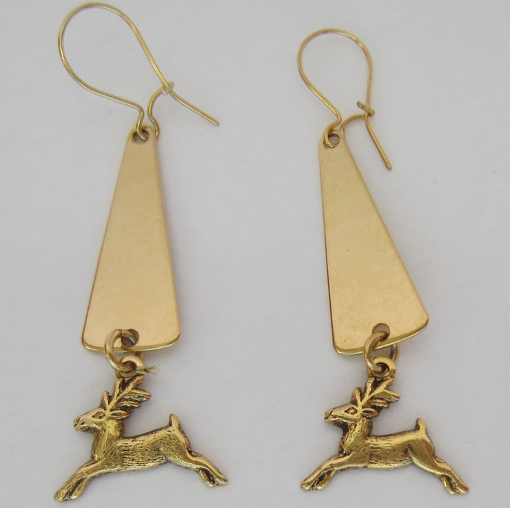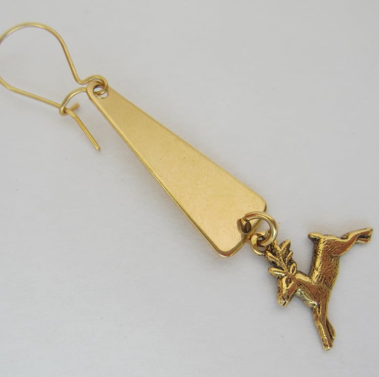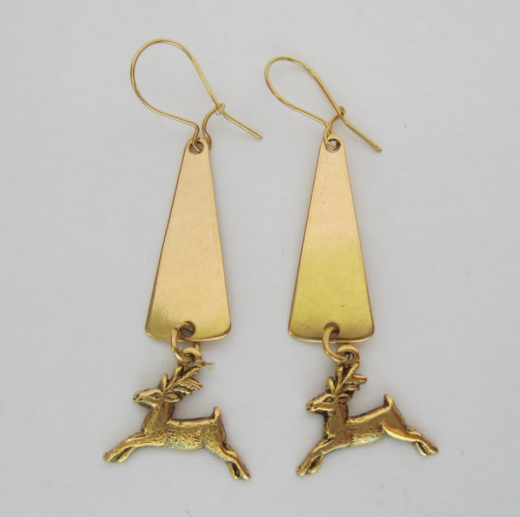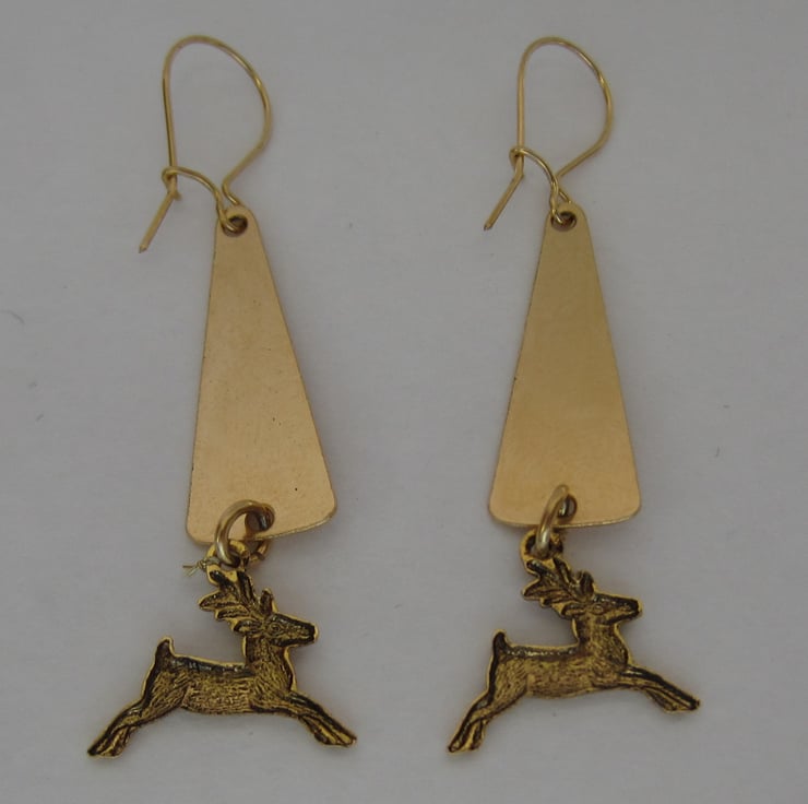 Pair of Christmas earrings made from gold tone metal triangles and deer charms.