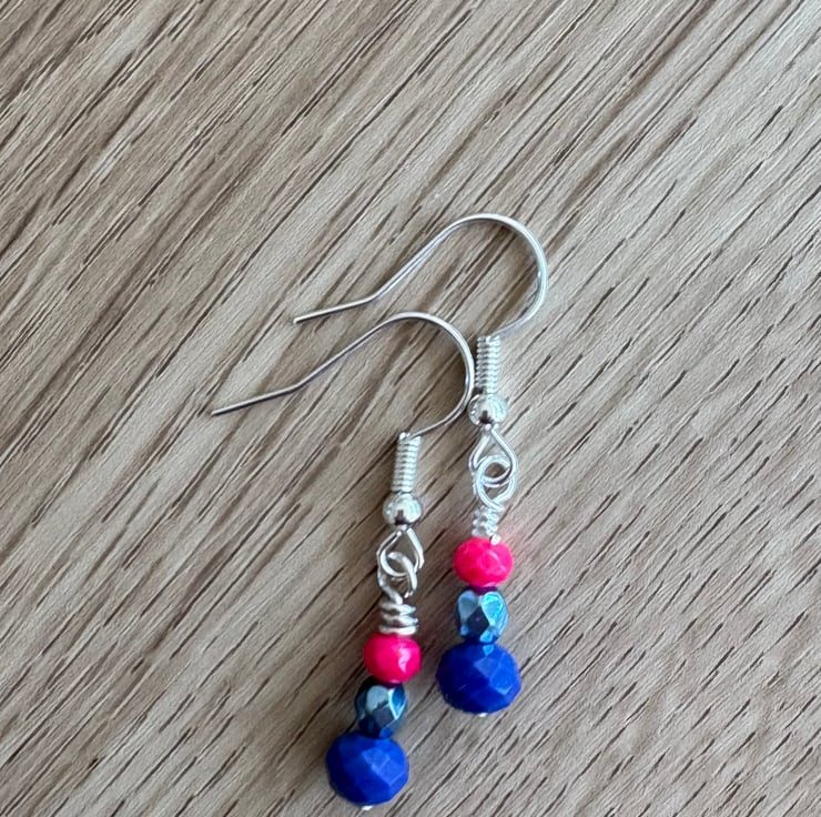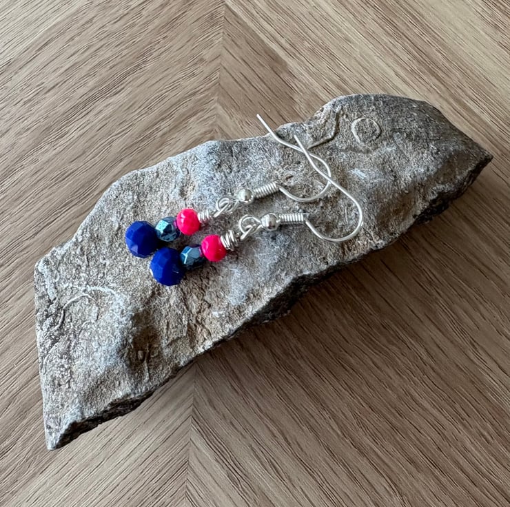 Lovely blue and pink earrings made from small blue rondelle beads, effervescent blue fire polished beads and small pink rondelle beads.
