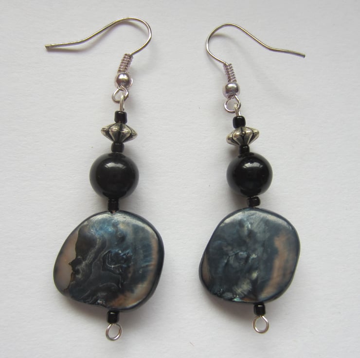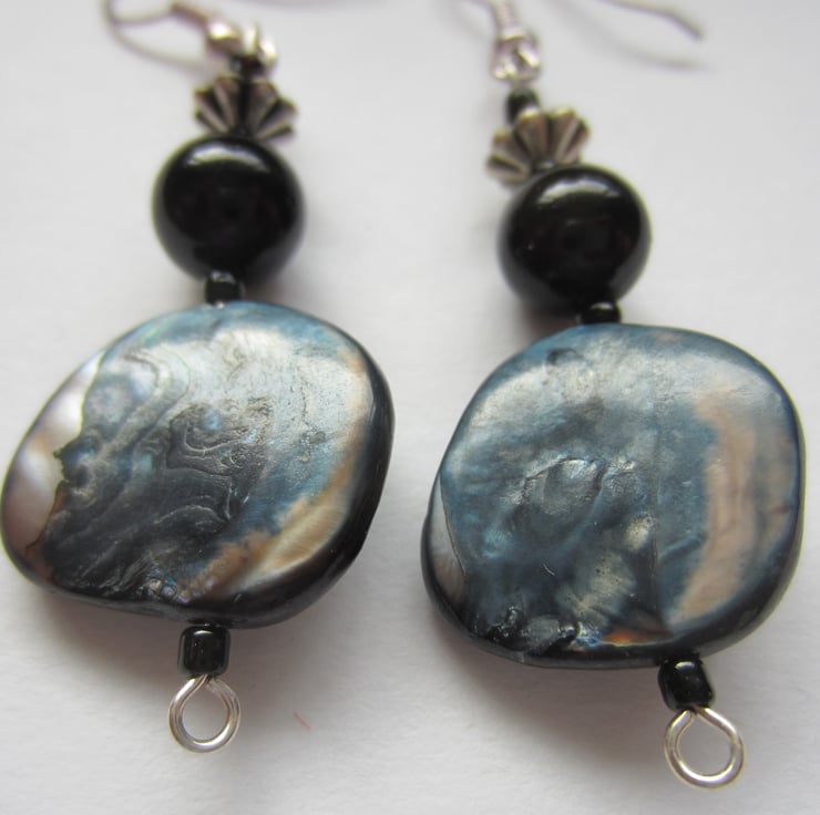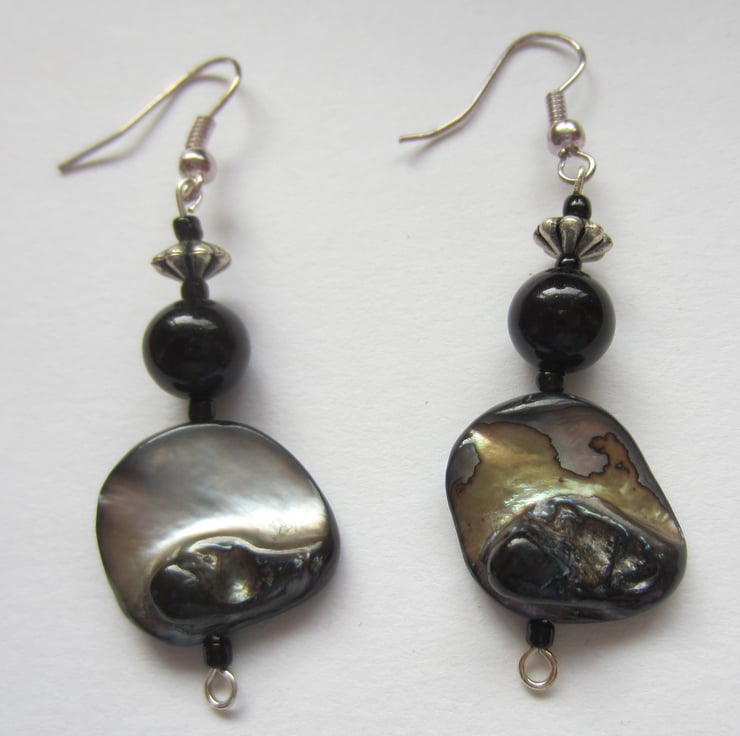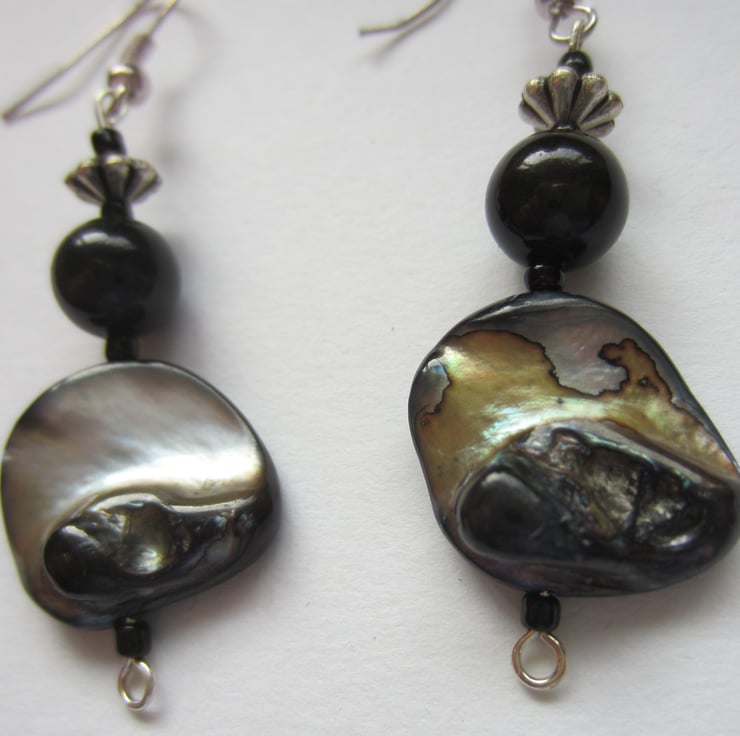 Pair of earrings made from black and silver beads. The large beads have been rescued from a broken vintage necklace and have an abalone shell look.