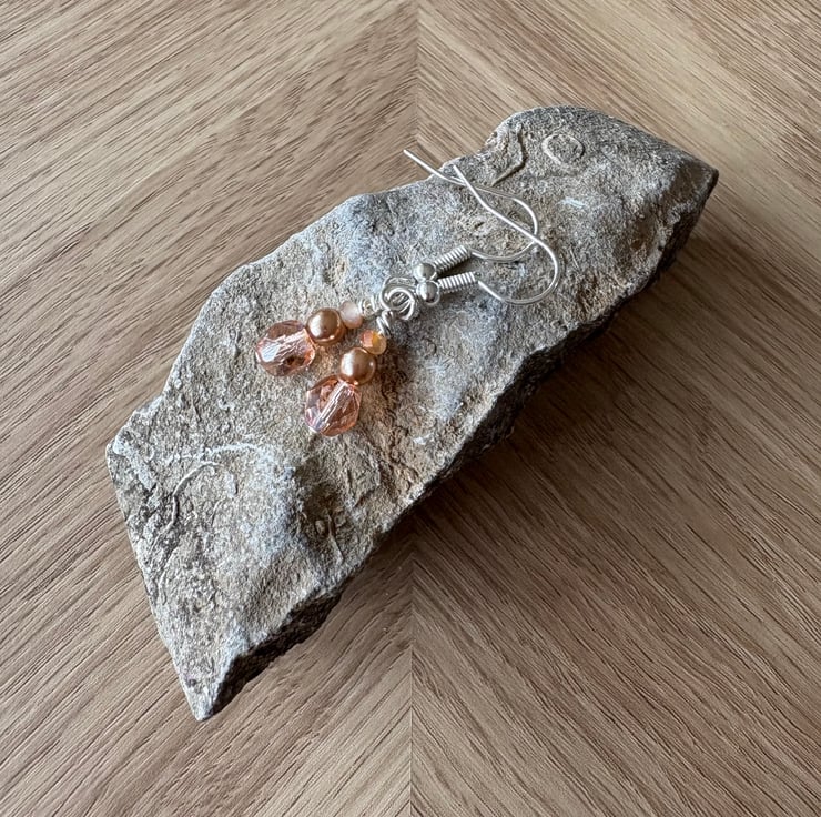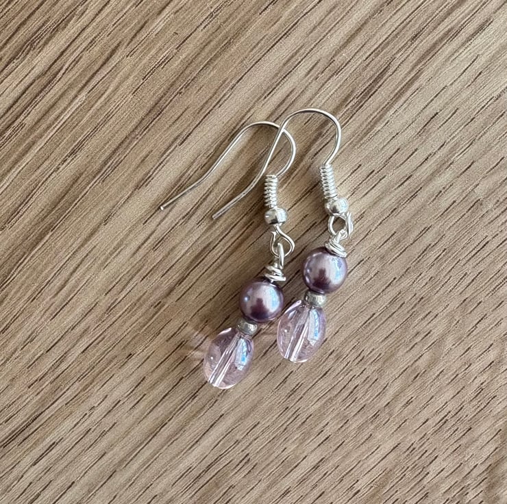 Delicate pale pink dangle and drop earrings made from pale pink transparent oval shaped beads, pinky mauve seed beads and glass pearls.