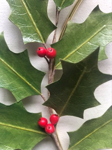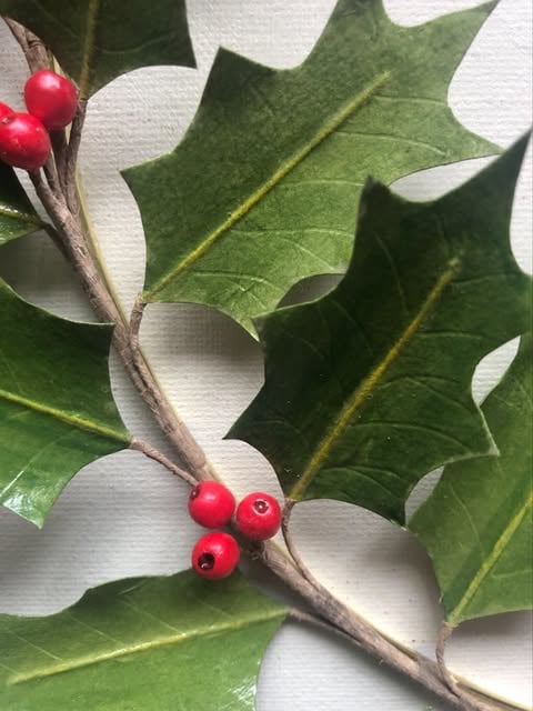 A pale gold-coloured metal decorative wall hoop adorned with a handcrafted paper holly leaves and berries. The leaves are made from four layers of mulberry paper glued together for durability, then coloured with inks and pastels and finished with varnish for a lifelike sheen. The berries are also hand painted and a glossy varnish applied. This simple, classic foliage hoop would bring a touch of nature to any room and make an elegant Christmas decoration.