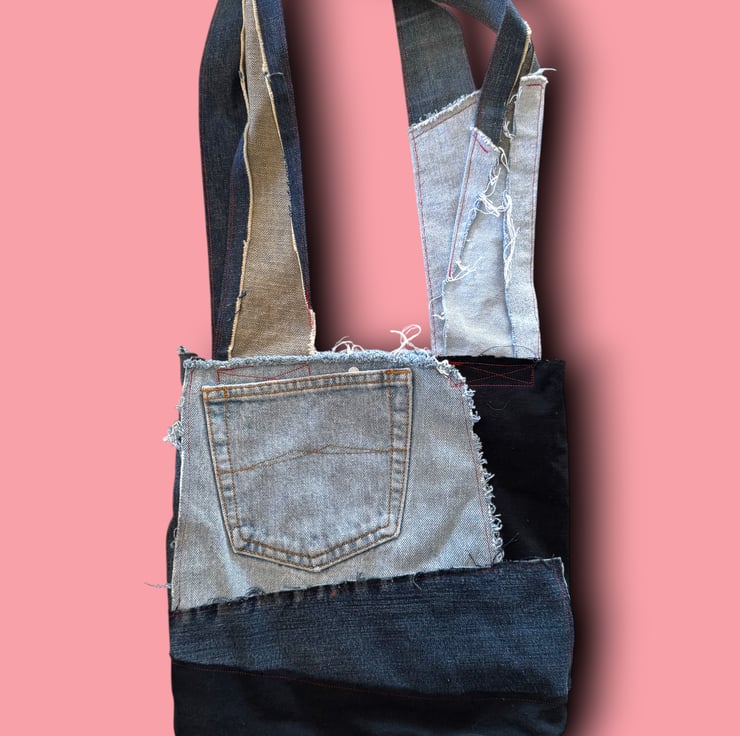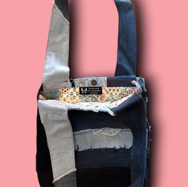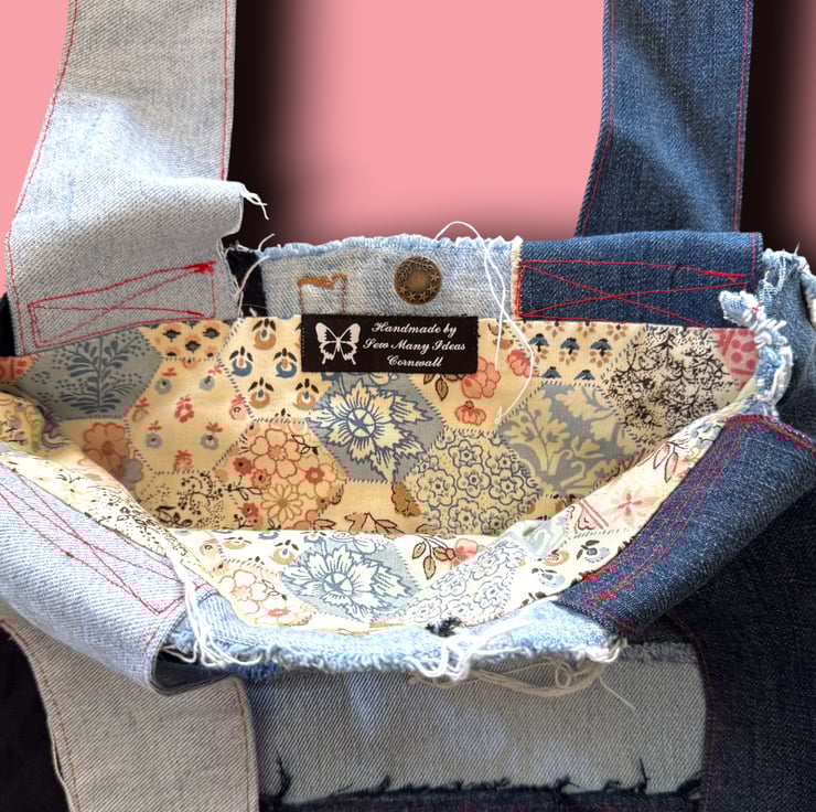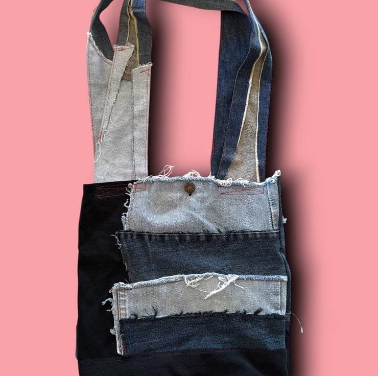 This bag was born from our love of reusing and reimagining fabrics. Every scrap of denim has a story, and by leaving the raw edges exposed, we celebrate those imperfections and give them new life. The patchwork lining adds a softer, playful contrast, reminding us that sustainability can be stylish and full of personality. Each bag is a little reminder that fashion doesn’t have to cost the earth.