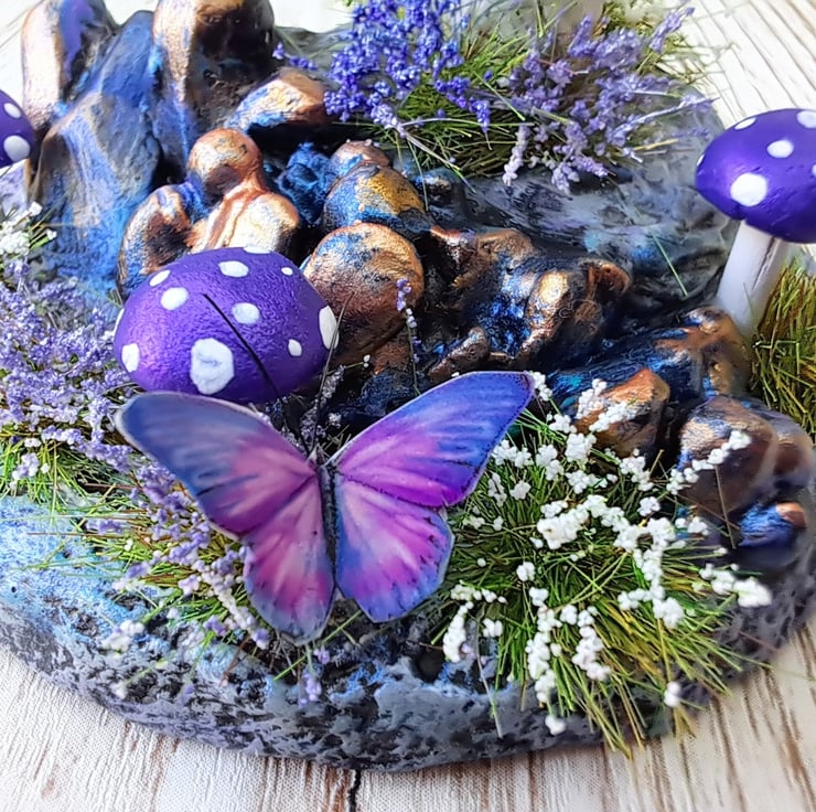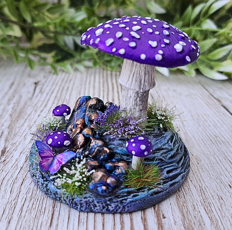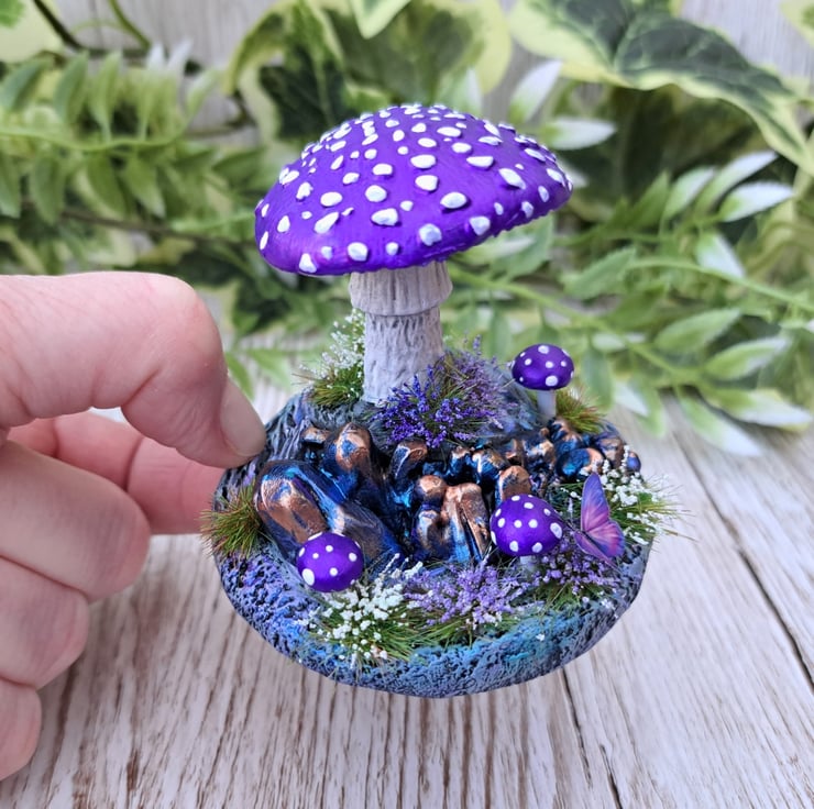 This miniature handmade mushroom scene is sculpted from air drying clay and finished in a shimmering metallic purple that really catches the light. The base is built on MDF and covered in textured clay, decorated with crystal like rock formations painted in blues, purples and touches of gold for a magical effect.