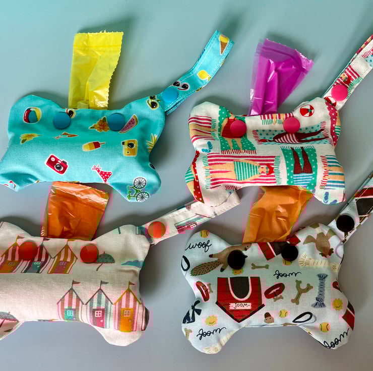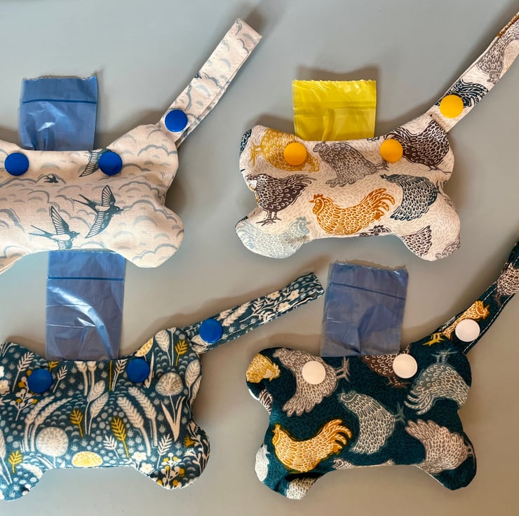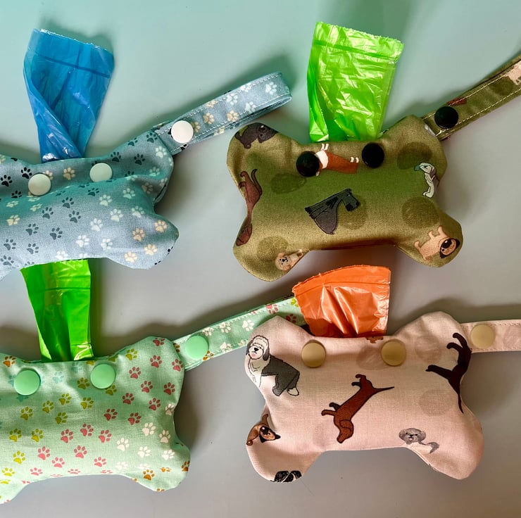 These bone-shaped dog poo bag holders are all handmade in different fabrics and are supplied with some poo bags inside.