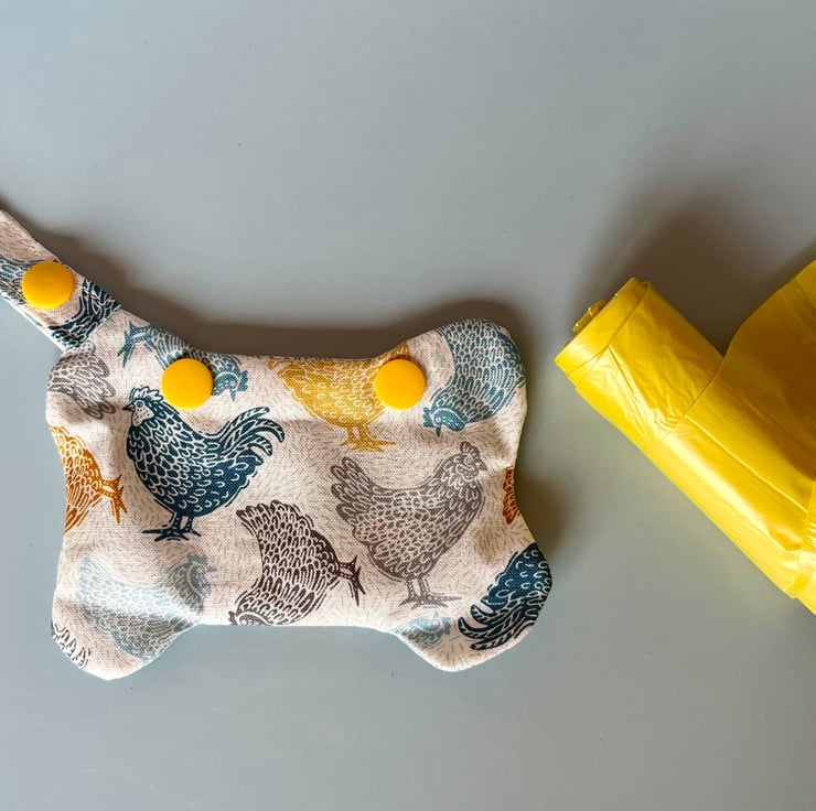 The dog poo bags are made from printed cotton fabric and have a loop which can be clipped on to your bag, dog lead, dog collar and belt loop