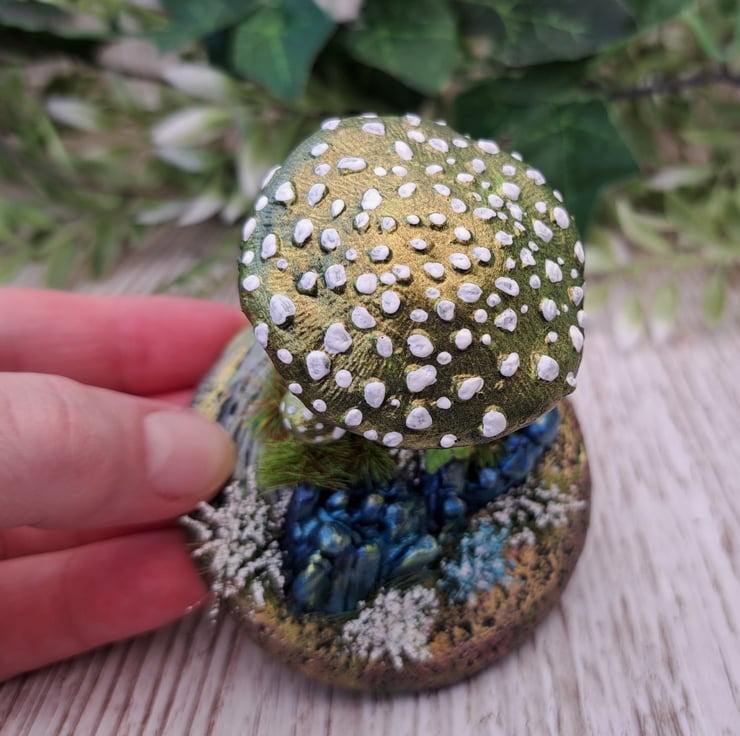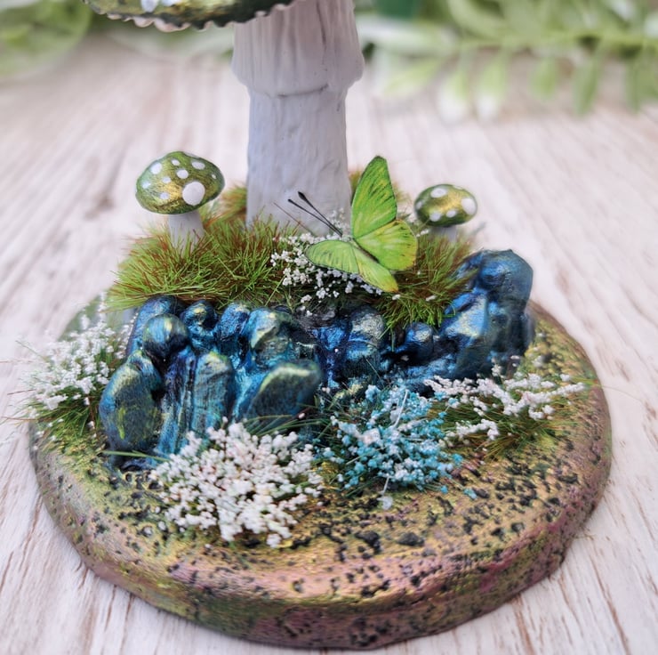 A magical toadstool, handmade from air drying clay in metallic green gold. The toadstool sits on an MDF base covered in textured clay and painted in metallic greens and golds. The sculpted rocks are painted in metallic teal blue, there are two mini mushrooms and a matching butterfly. The scene is finished off with pretty matching foliage.