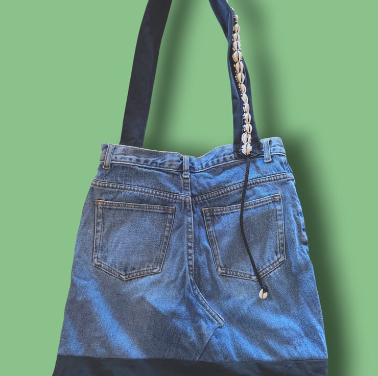 Embrace sustainable style with this unique tote bag, lovingly crafted from upcycled denim jeans and soft T-shirt material, finished with a charming shell belt detail. Each element has been thoughtfully repurposed, creating a one-of-a-kind accessory that brings a touch of coastal charm to your everyday wardrobe.