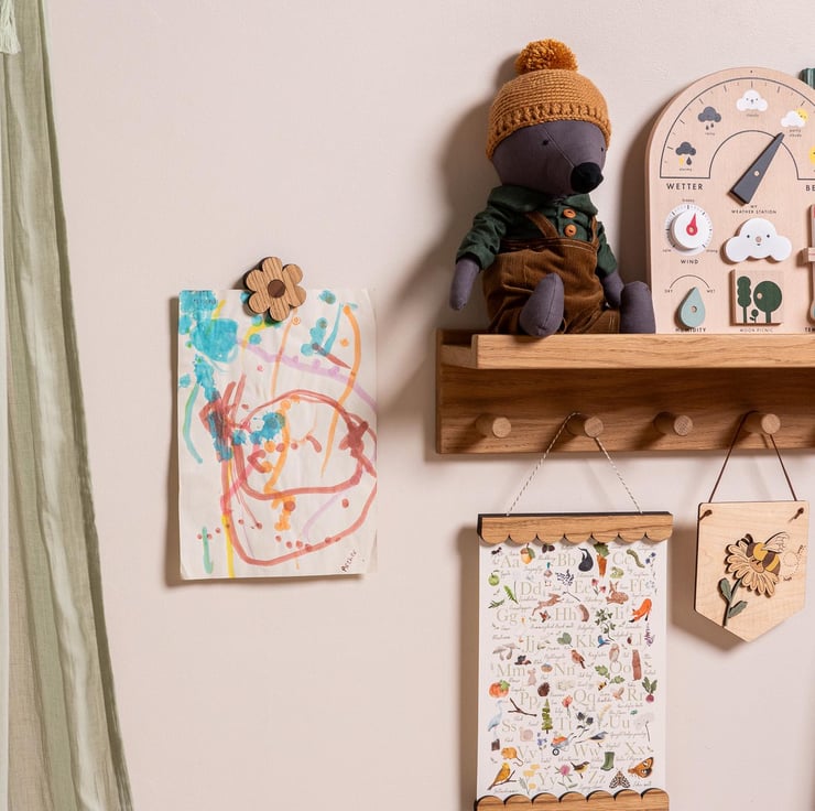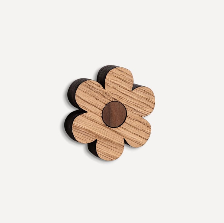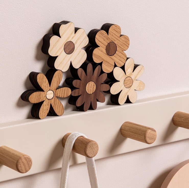 A two-part magnetic flower hanger for kid's artwork and prints. Made with Oak and Walnut veneered MDF.