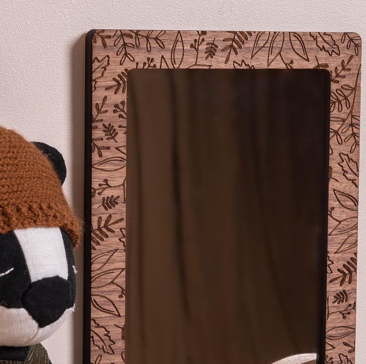 The Woodland Leaf Engraved Kid's Safety Mirror In Walnut by Nestie.