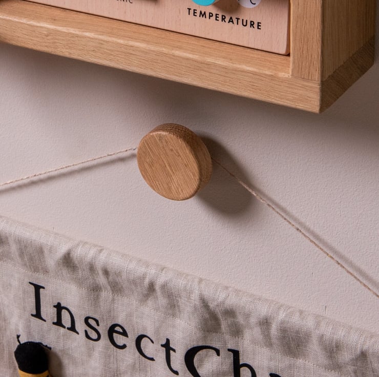 The wall hooks measure 5cm in diameter and are approximately 2.5cm (1inch) tall off the wall and are made from a single piece of solid Oak wood.