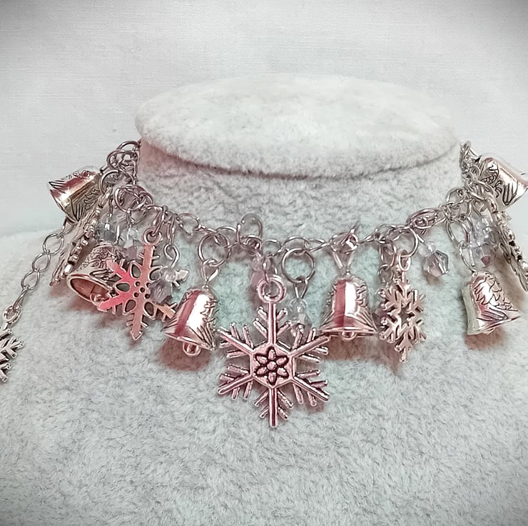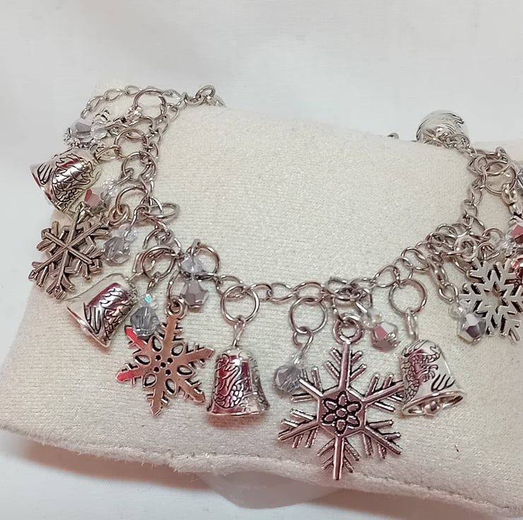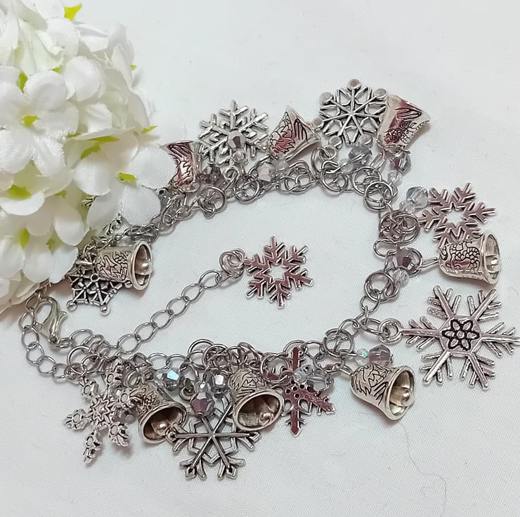 This exquisite bracelet features a charming mix of snowflakes in various sizes, silver bells, and sparkling crystals. Crafted with a durable stainless steel chain, it is hypoallergenic and resistant to tarnishing.Available in various sizes, it arrives carefully wrapped for protection and includes an elegant organza gift bag. For an added touch, a gift box option is available in the dropdown menu.