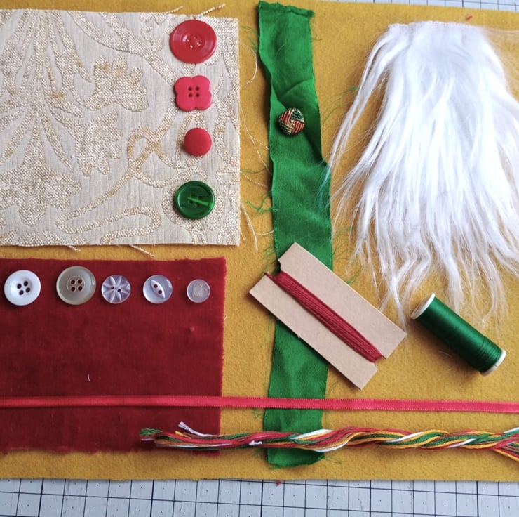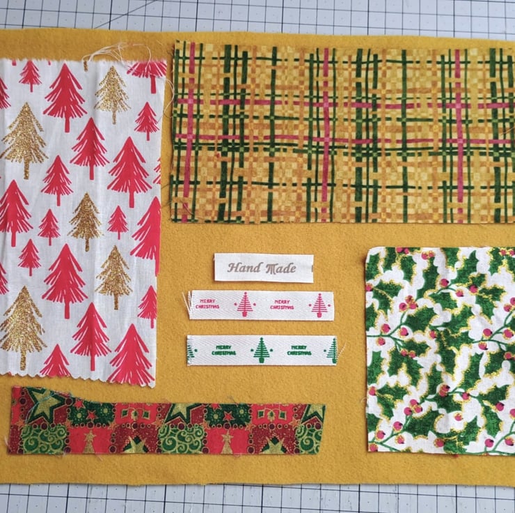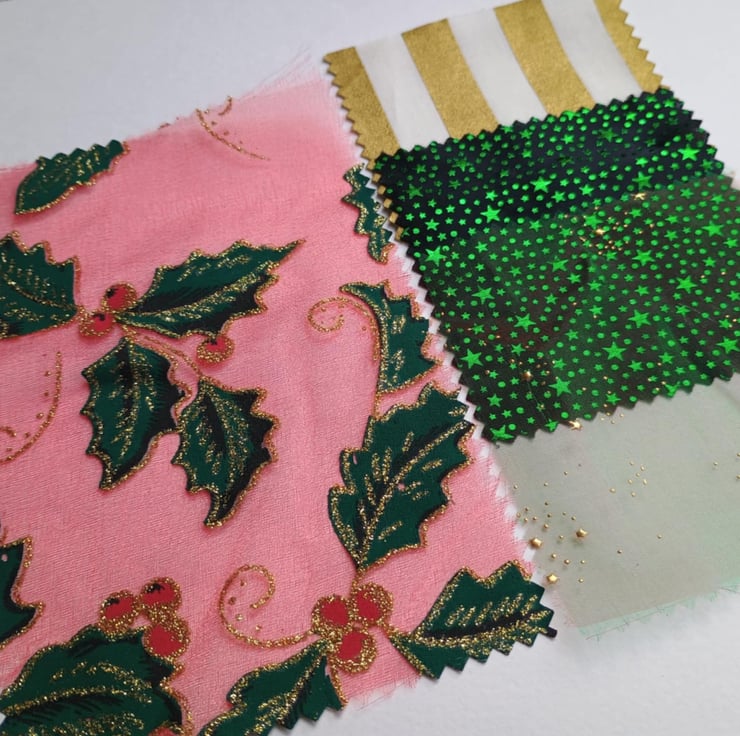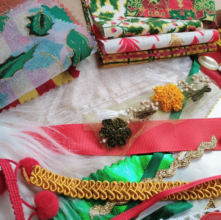Glittery Christmas - my sparkly holly leaf inspiration bundle is full of vintage, pre-loved and factory waste textiles, haberdashery and trims. Ideal for making small craft projects, as well as slow stitching and textile art.
