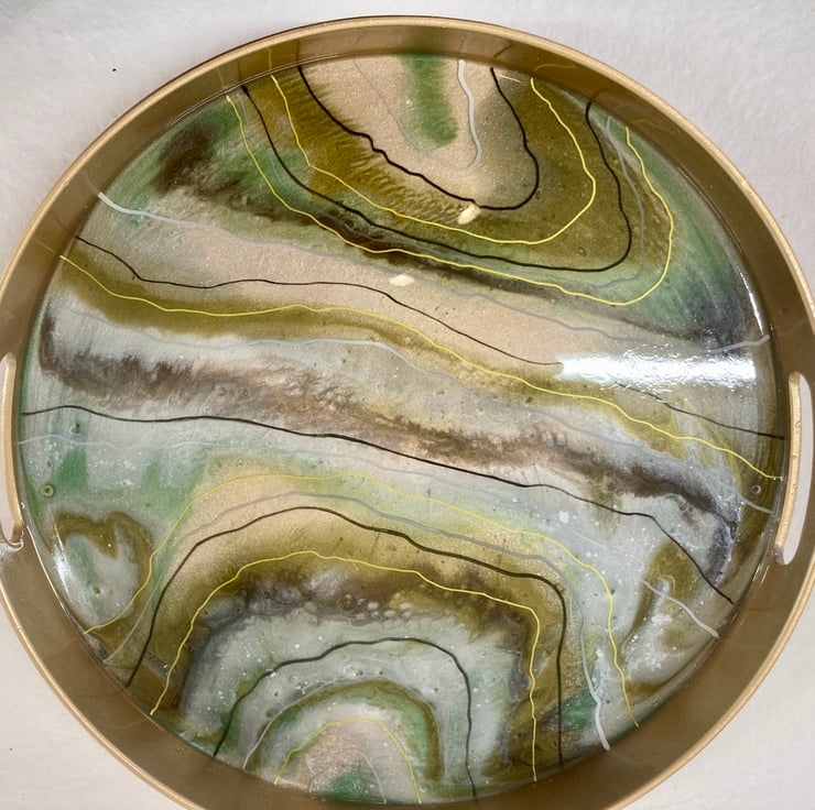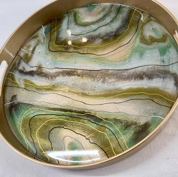 This unique drinks tray is made to add elegance and vibrancy to any home. The colour combination on this unique piece consists of creams, greens, brown and gold. Resin is layered to create a design inspired by Geodes.