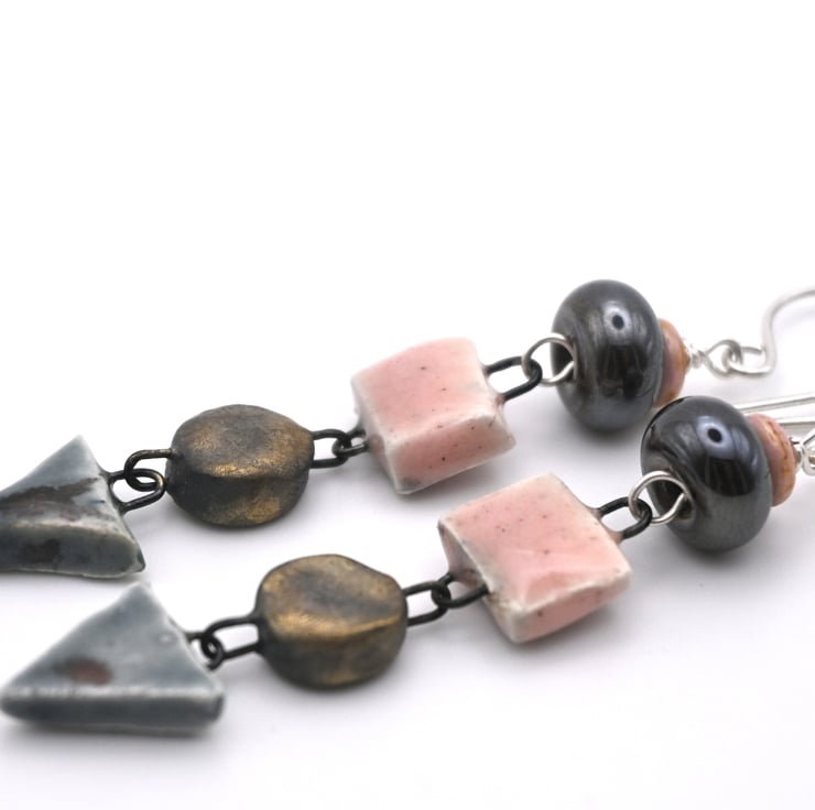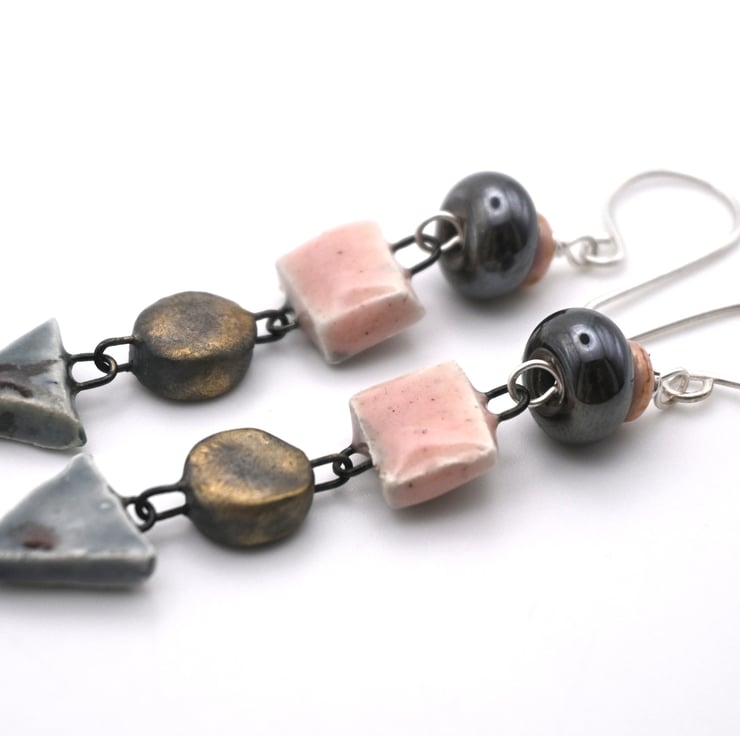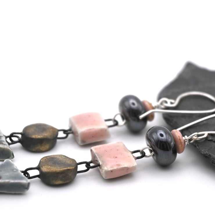A pair of sterling silver earrings featuring grey metallic handmade lampwork glass beads and grey and pink ceramic drops.