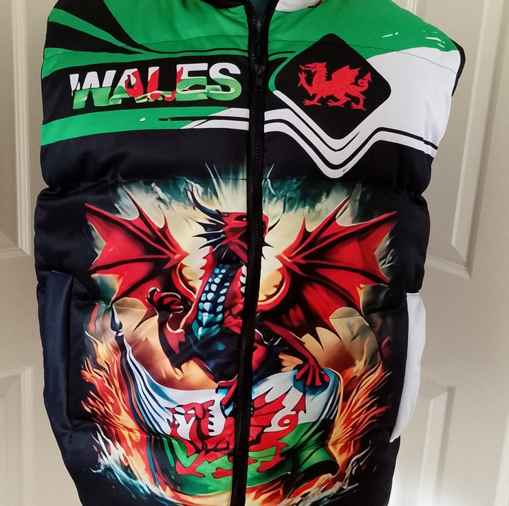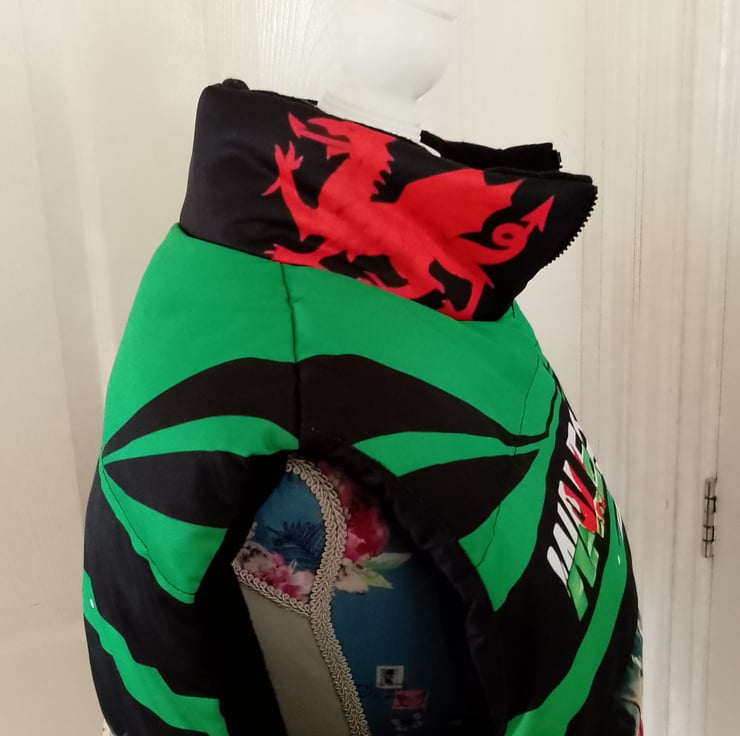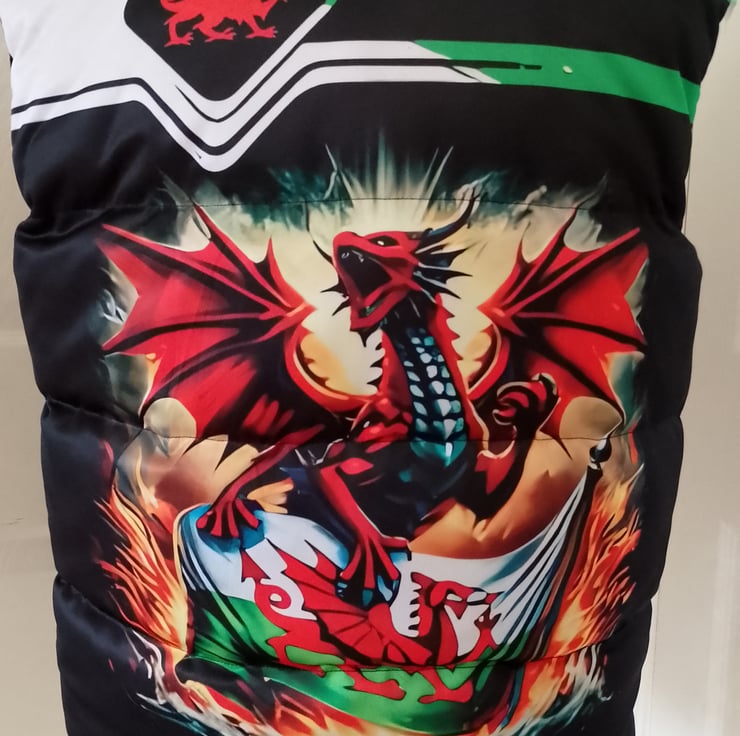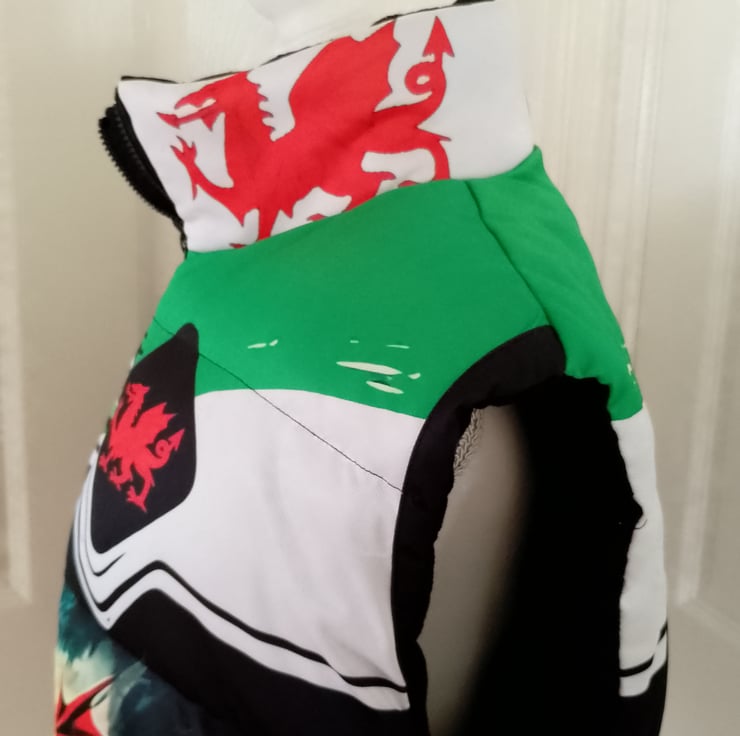 The jacket has the same design front and back of a large red welsh dragon.