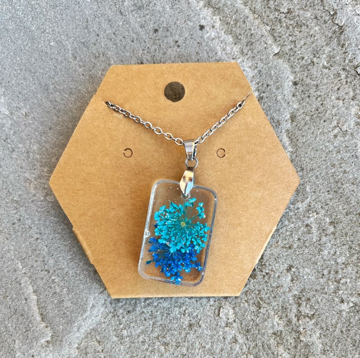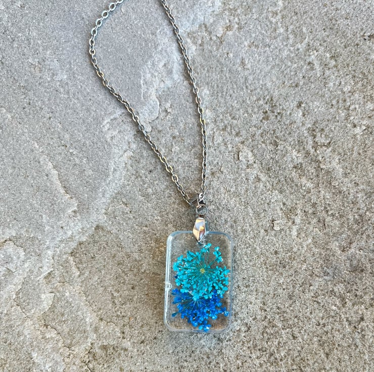 Made using stainless steel, resin and blue dried flowers. Resin will have minor flaws such as small air bubbles.