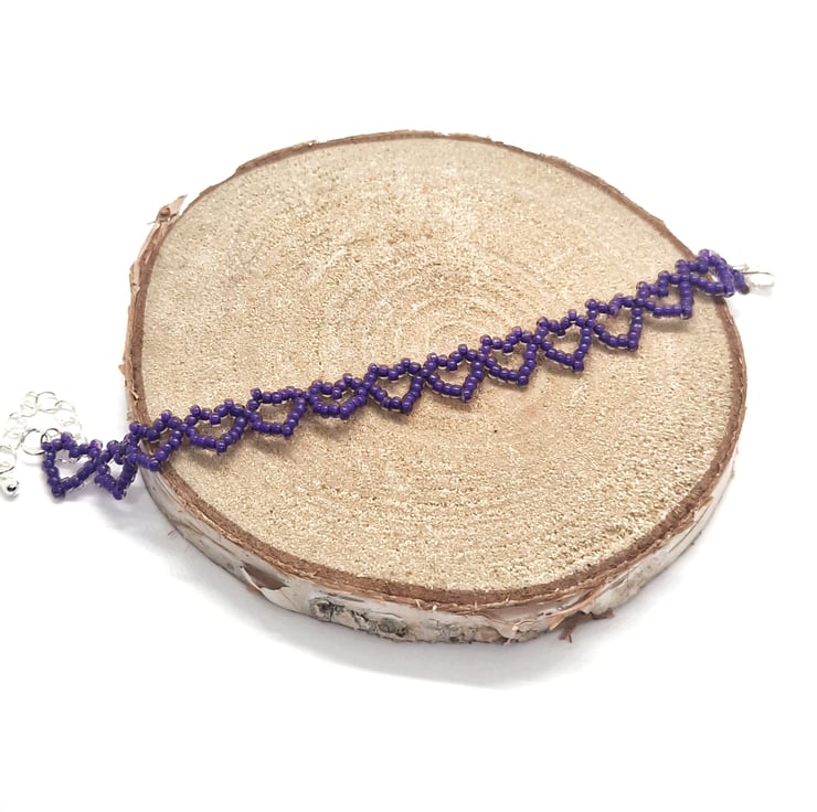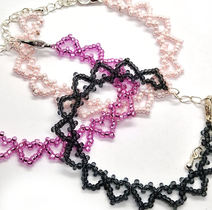 These sweet heart motif bracelets are made using seed beads, nymo beading thread and silver plated clasps and extender chains.