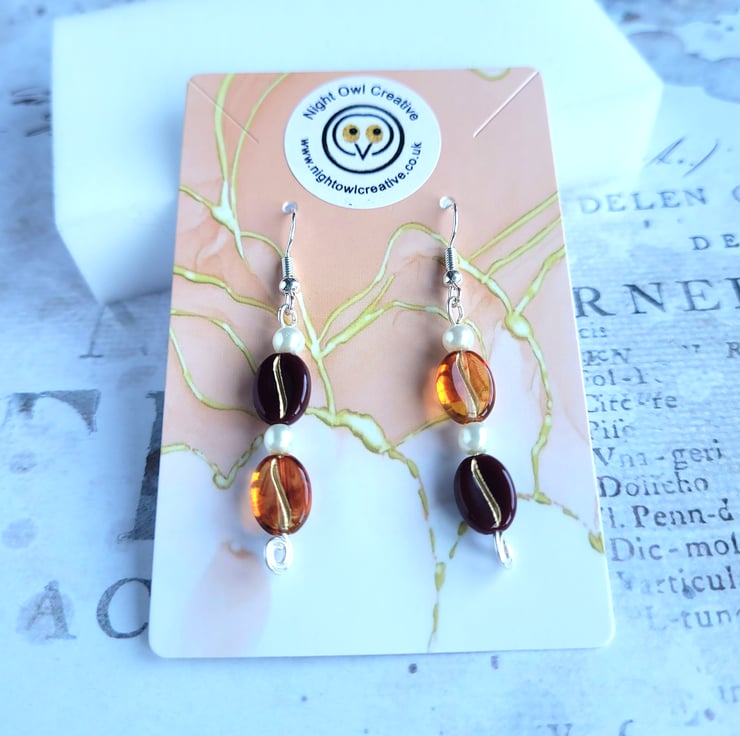 Coffee Bean Earrings, with quirky beads created to resemble real coffee beans, in colours of opaque espresso with shimmering translucent brandy.