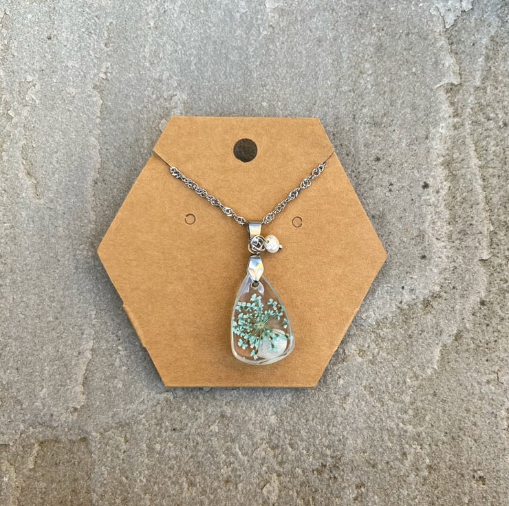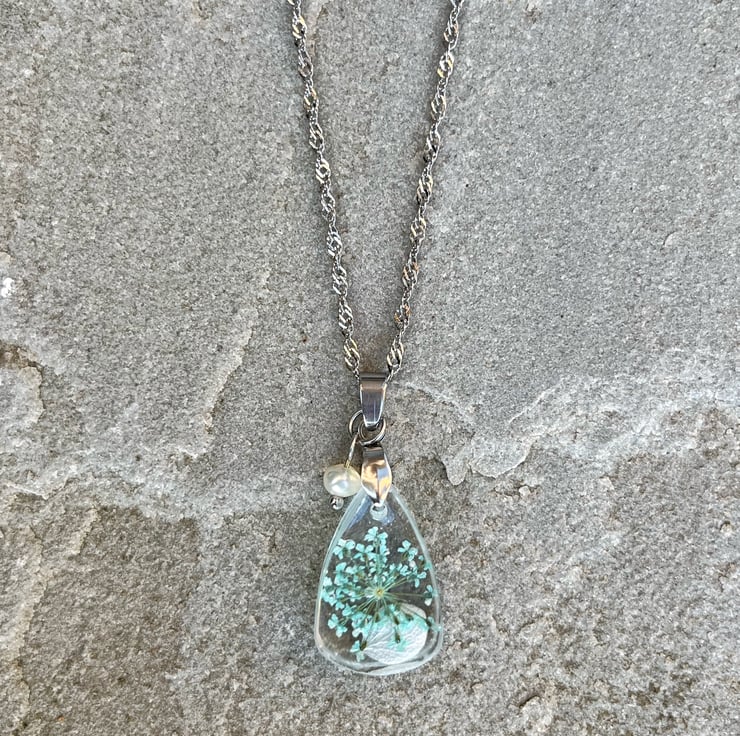 Made using blue pressed flowers, resin, stainless steel and a freshwater pearl.