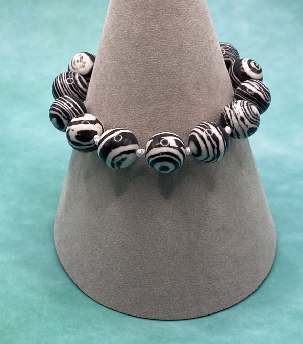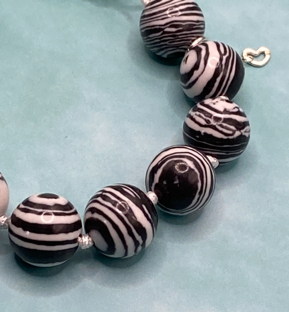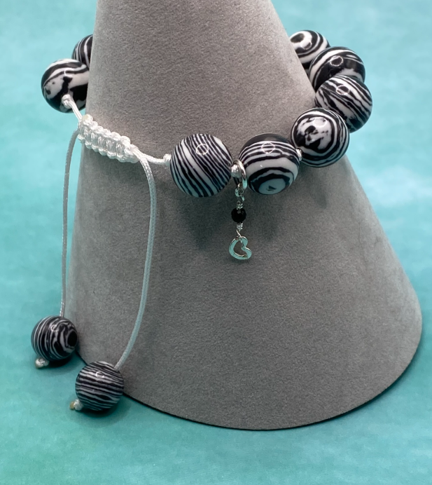 Knotted white satin cord bracelet featuring black and white faux fordite stones, finished with a silver plated heart and black agate charm.