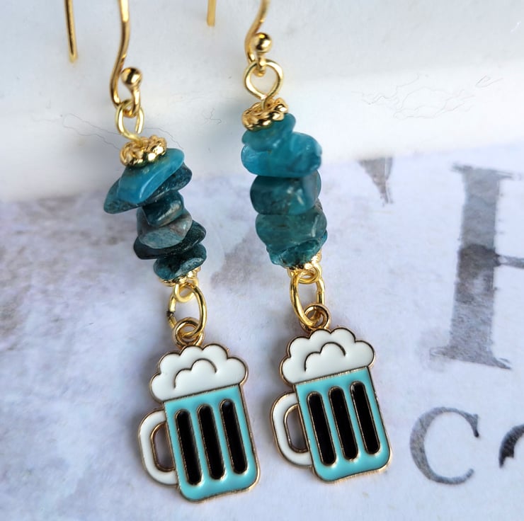 Oktoberfest Earrings, with quirky charms representing the traditional drinking vessel for beer - the bierkrug or stein. The blue-enamelled charms hang from a stack of gorgeous natural apatite gemstone chips with high quality gold plated spacers and ear wires.