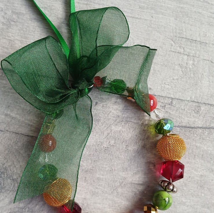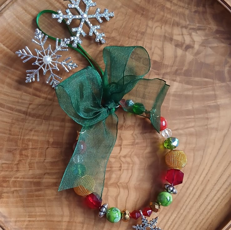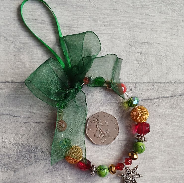 A traditionally themed beaded ring decoration, featuring a unique selection of beads in red, green, silver and gold. I've strung the beads onto silver plated craft wire with a snowflake charm in the centre, then finished with a ribbon hanging loop and green organza ribbon bow. The ring measures approximately 9 cm in diameter.