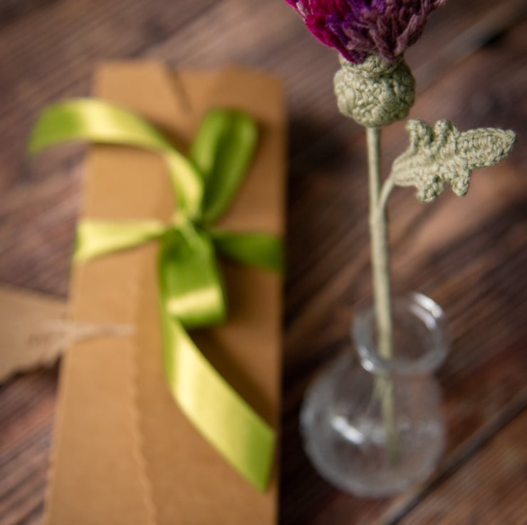 Thistle Flower Crochet Bookmark - a perfect gift for a book lover or a plant lover, someone of romantic nature, stationery fan or flower enthusiast. Can also be used as a decor item, it looks as good in a vase as it looks in a book. Thistles symbolise devotion, bravery, determination, and strength.