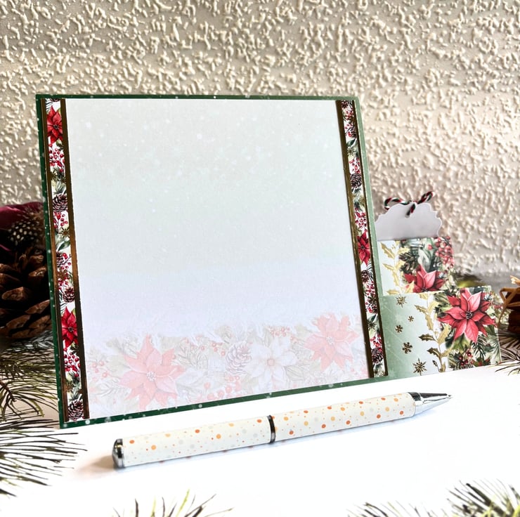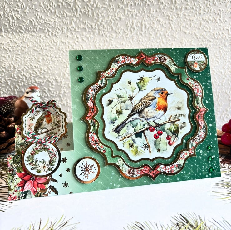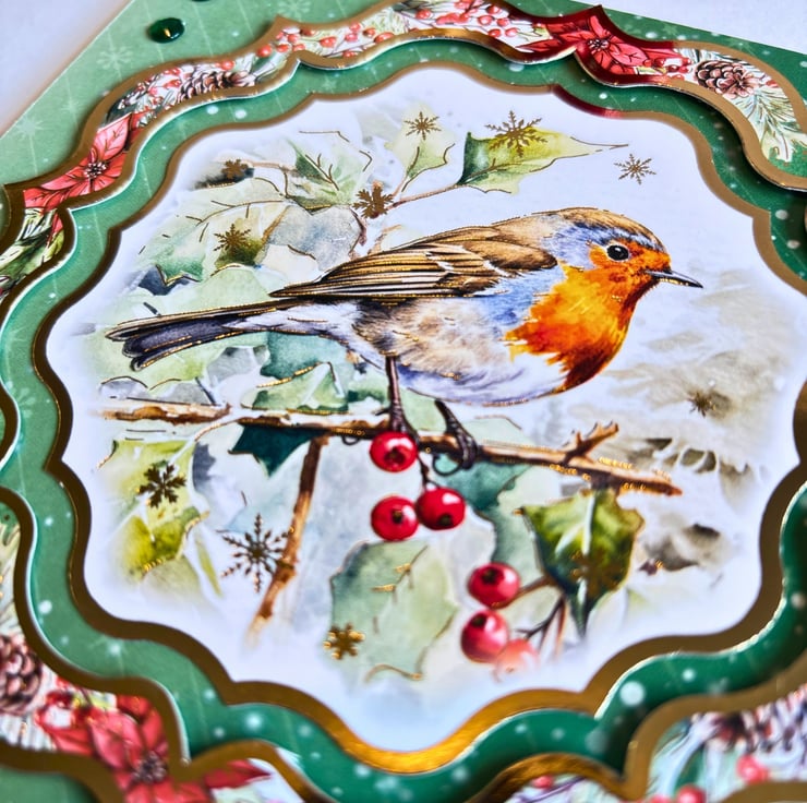 The quality patterned cardstock is cut to a stepper shape, with a gold foiled border of red poinsettia flowers on the left creating the 2 steps & the main topper on the right side of the card. It displays the robin on the twig and is surrounded by a gold foiled matching frame, raised for dimension. Coordinating toppers decorate the card, embellished with bows from matching twine and finished with green gemstones either side of the main topper. At the back, two border strips decorate the insert panel, which has been left blank for you to add your handwritten wishes and add a personal touch.
