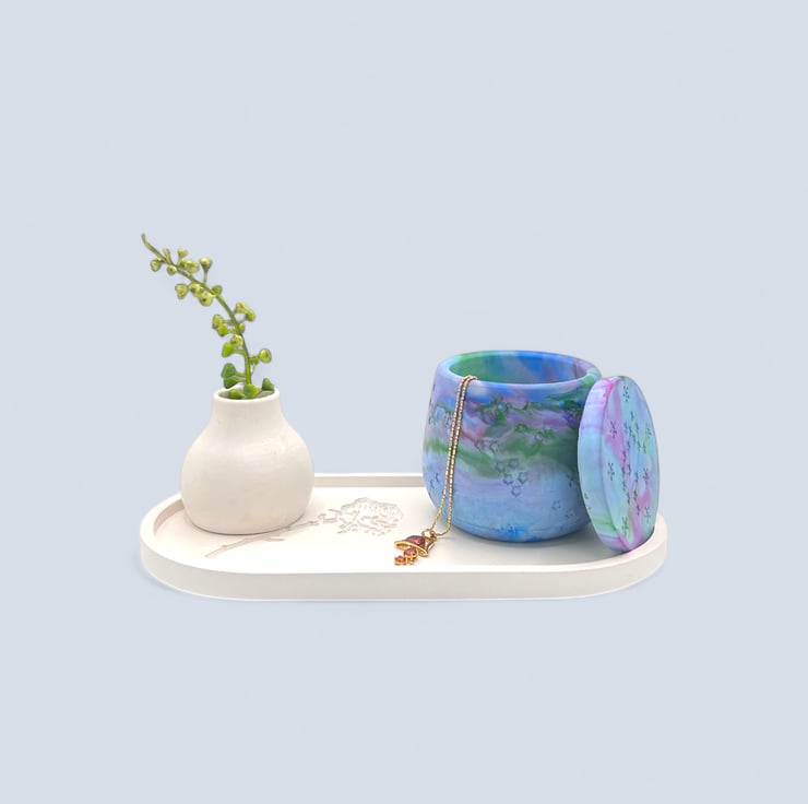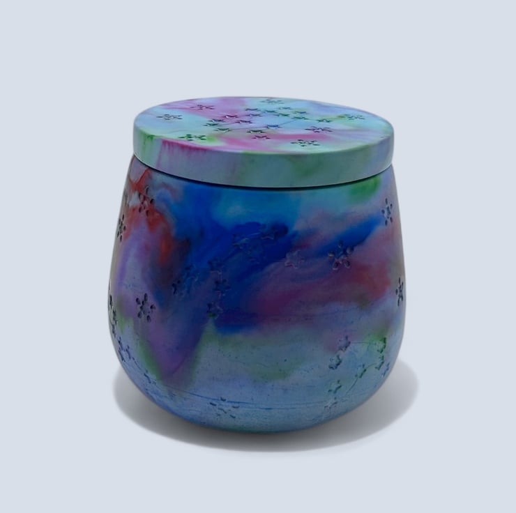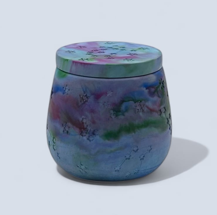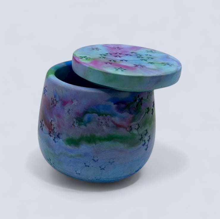 In October 2024 I saw the Northern Lights for the first time. The colours dancing across the sky inspired the marbled purples, blues and lilacs of this piece. Creating by hand is also how I express myself and find calm, so each pot carries both that sky and that feeling. My love for nature is at the heart of everything I make, and I hope this jewellery box brings a little of that wonder into your home.