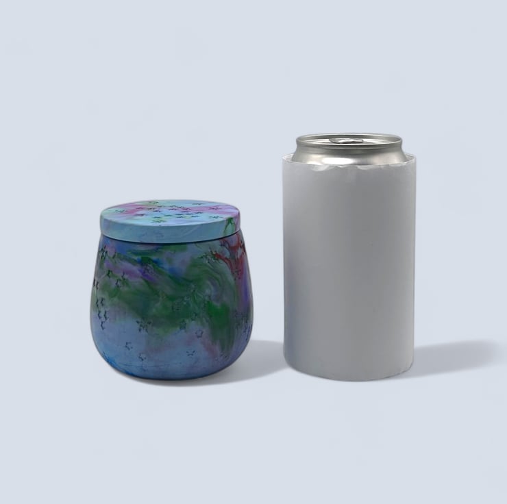 The design features a soft blue base swirled with purple, pink, green and touches of red, inspired by the shifting colours of the Aurora Borealis. Star and constellation motifs across the lid and sides add a celestial touch. Each piece is carefully hand-poured and polished, giving it a pleasing weight and a one-of-a-kind character.