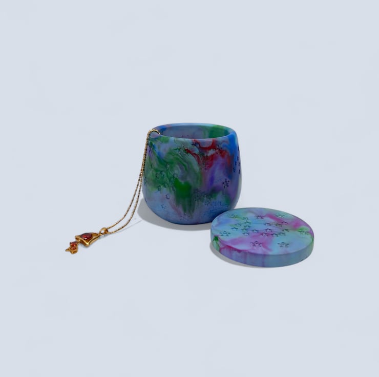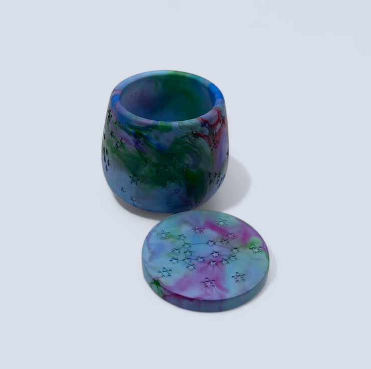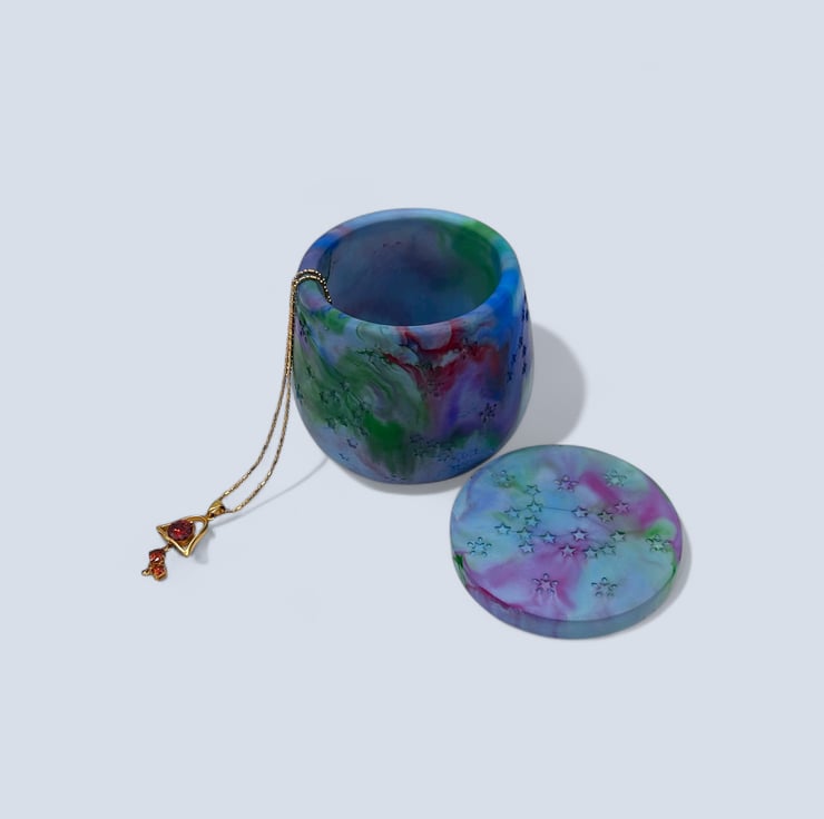 Purple, red, pink green and blue marbled jewellery box with constellation star details. This handmade trinket pot has a smooth stone-like finish and a fitted lid that can also be used as a coaster when holding a candle.