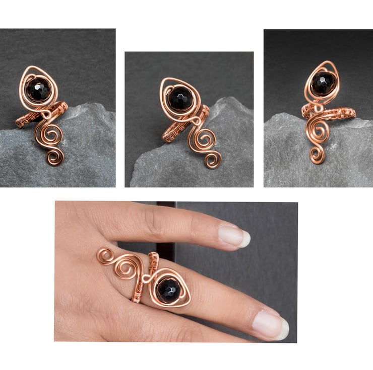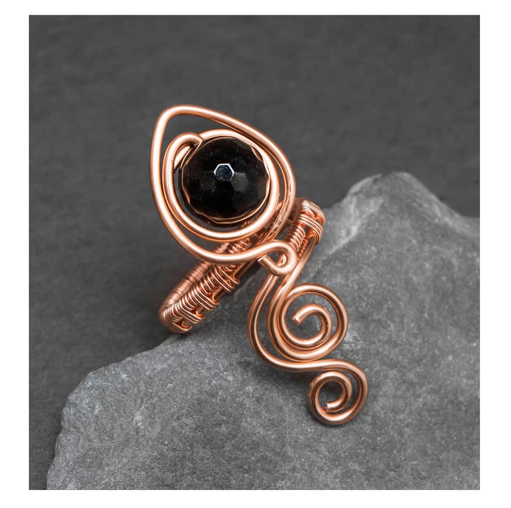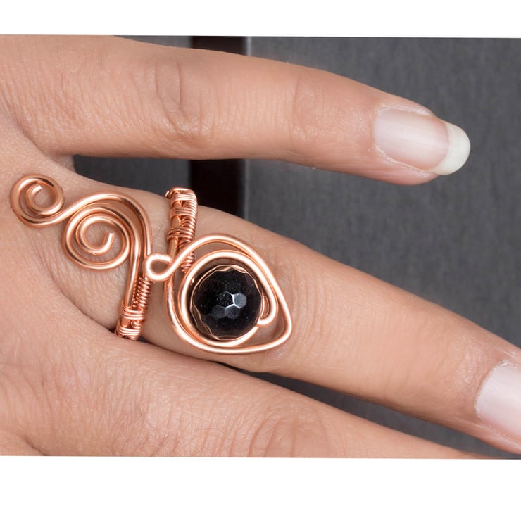 The combination of the intricate copper wire design and the striking black agate stone makes this ring a stunning accessory for any outfit.