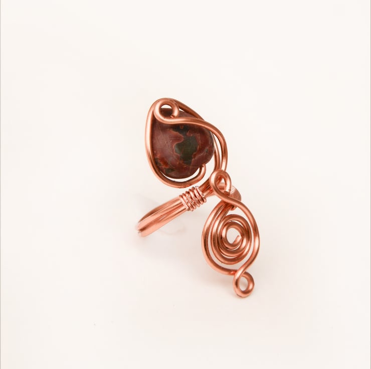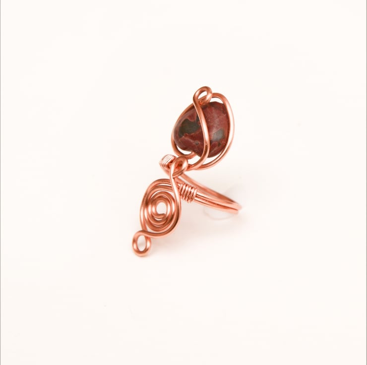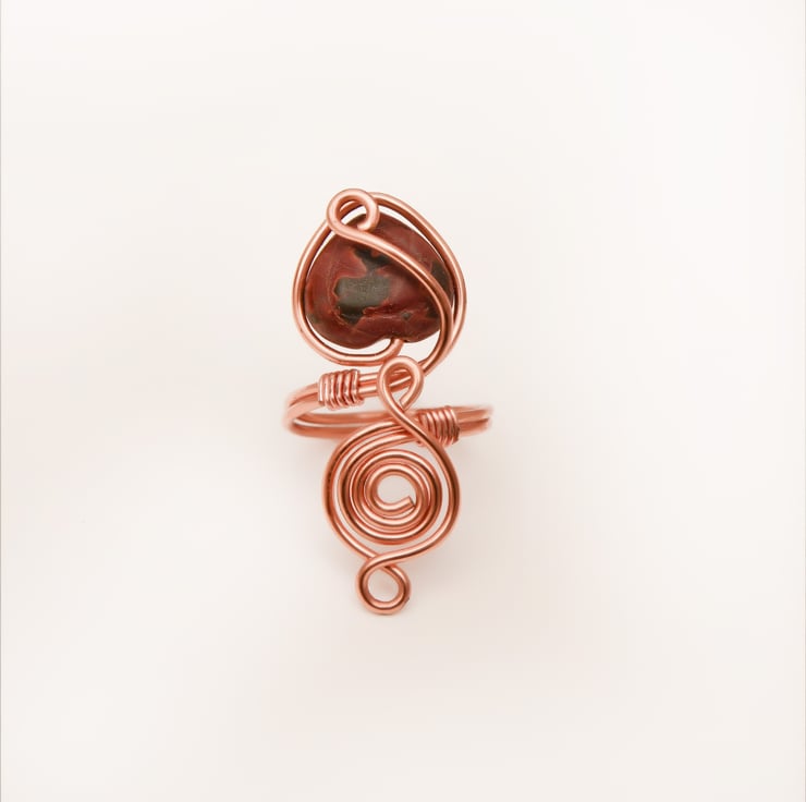 This unique ring is carefully handcrafted from durable copper wire and features a natural Jasper gemstone, securely wrapped in a beautiful wire design. The adjustable band ensures a comfortable fit for most sizes, making it versatile and easy to wear every day or on special occasions.