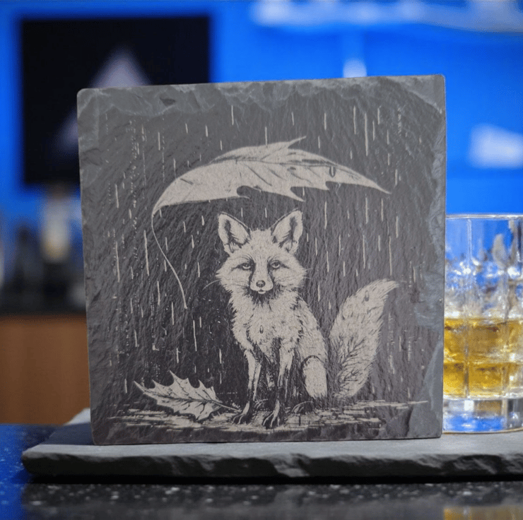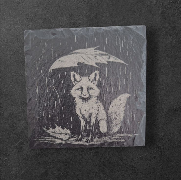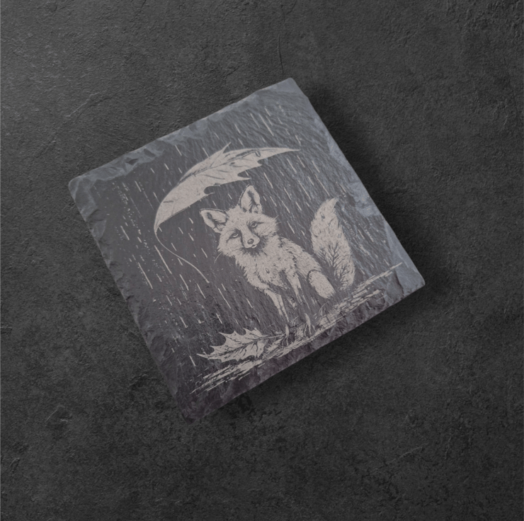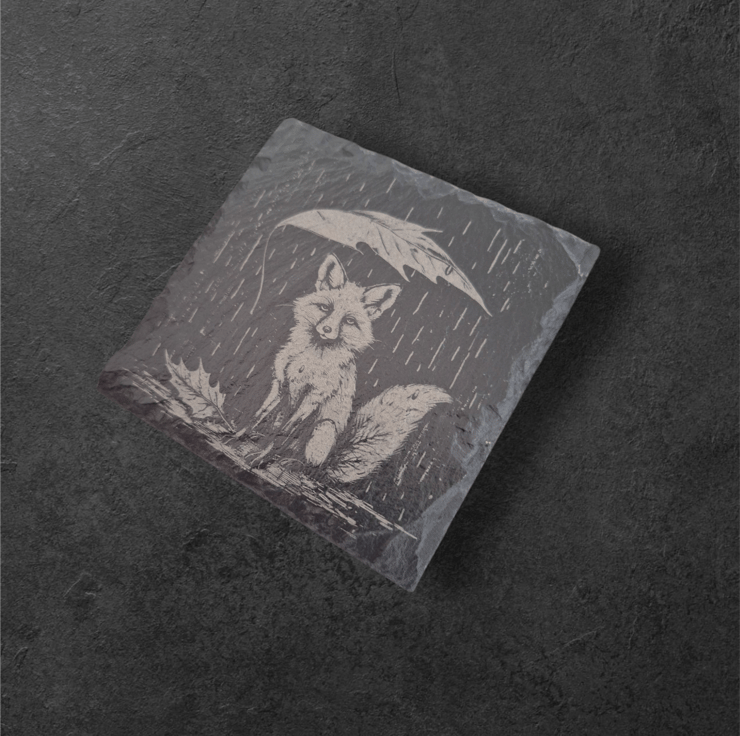 A charming natural slate coaster, etched with a fox sheltering beneath a leaf in the rain. This whimsical woodland design brings a little fairytale magic into the everyday, making your tea or coffee moments extra special.